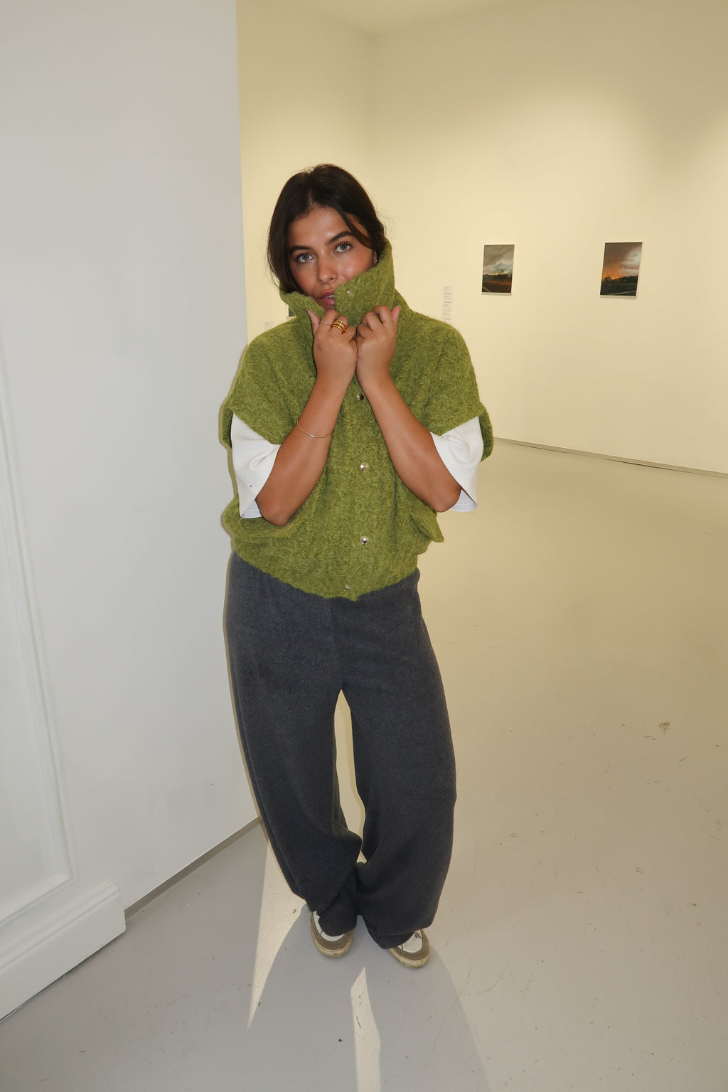 Crafted from plush, textured knit in a deep olive hue, the Anais Olive Jacket blends comfort with effortless edge. Its high funnel neckline and relaxed silhouette make it the perfect layering piece, structured yet soft, cozy yet refined. Pair it with tailored trousers or denim for a look that’s quietly statement-making.