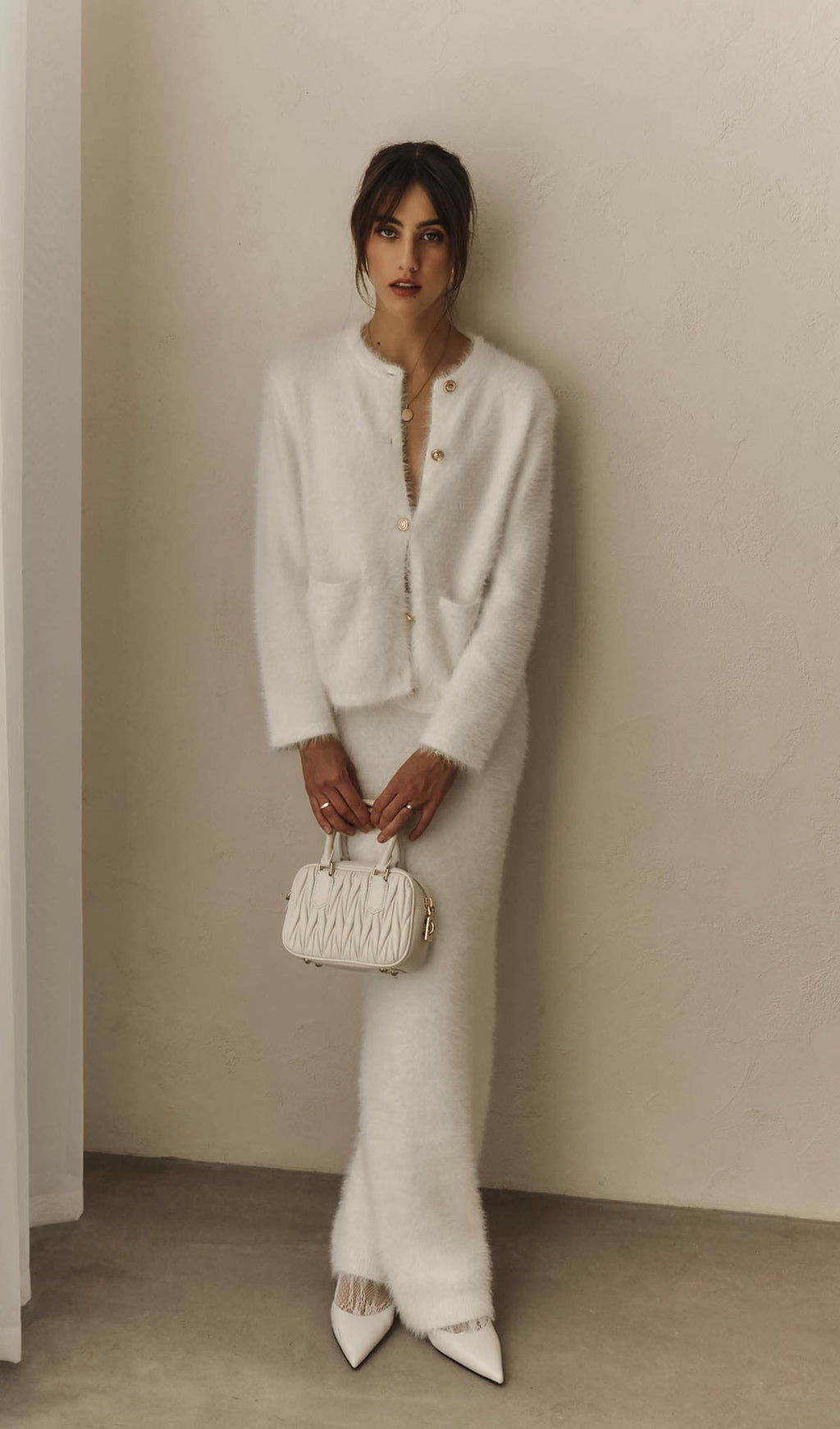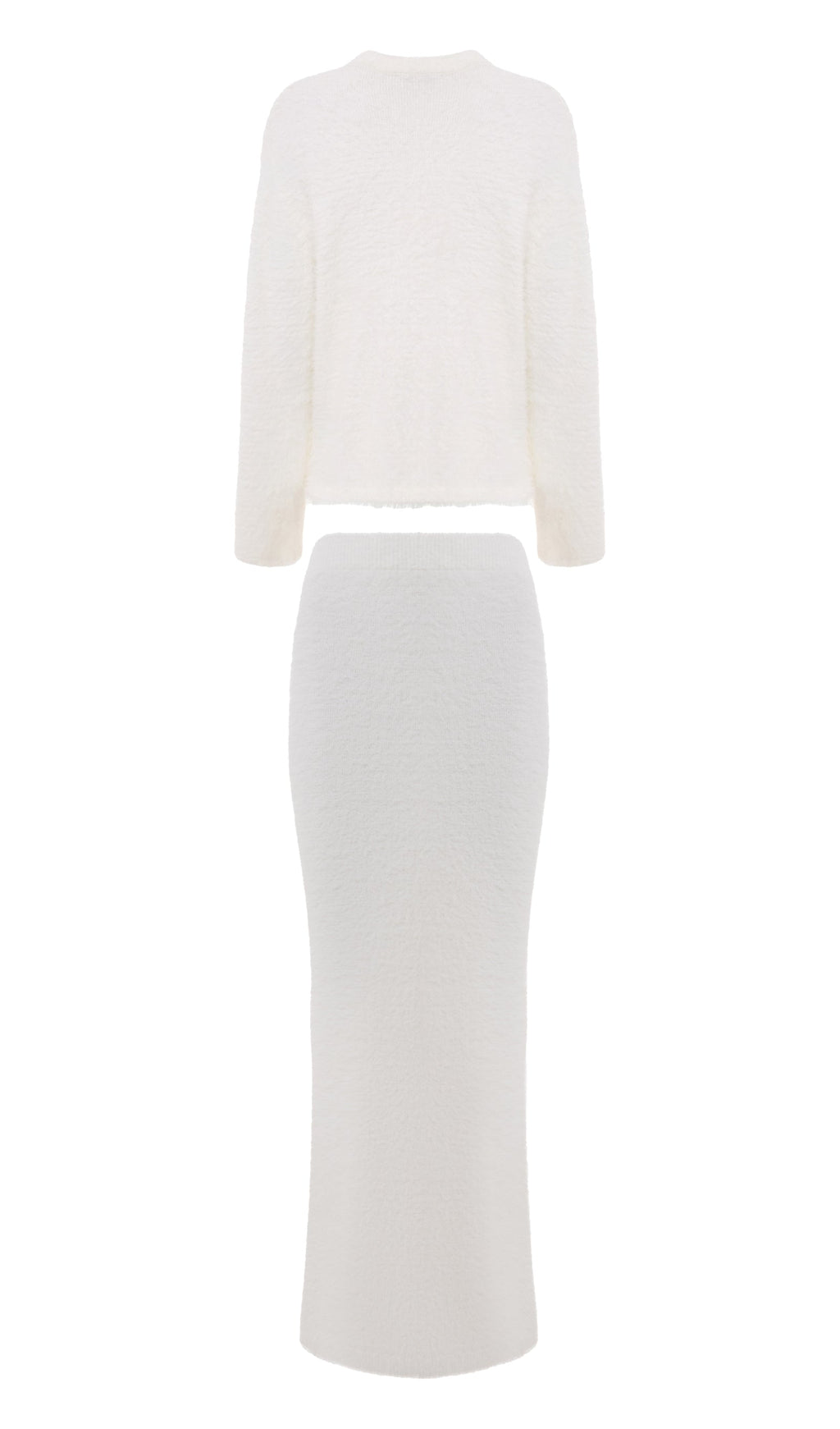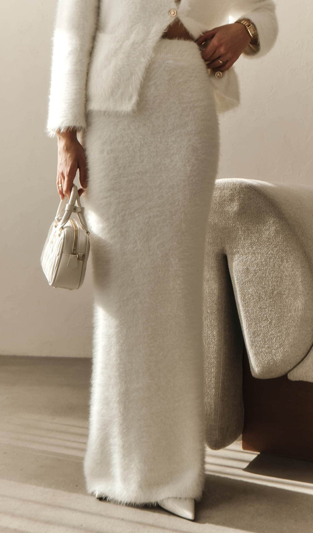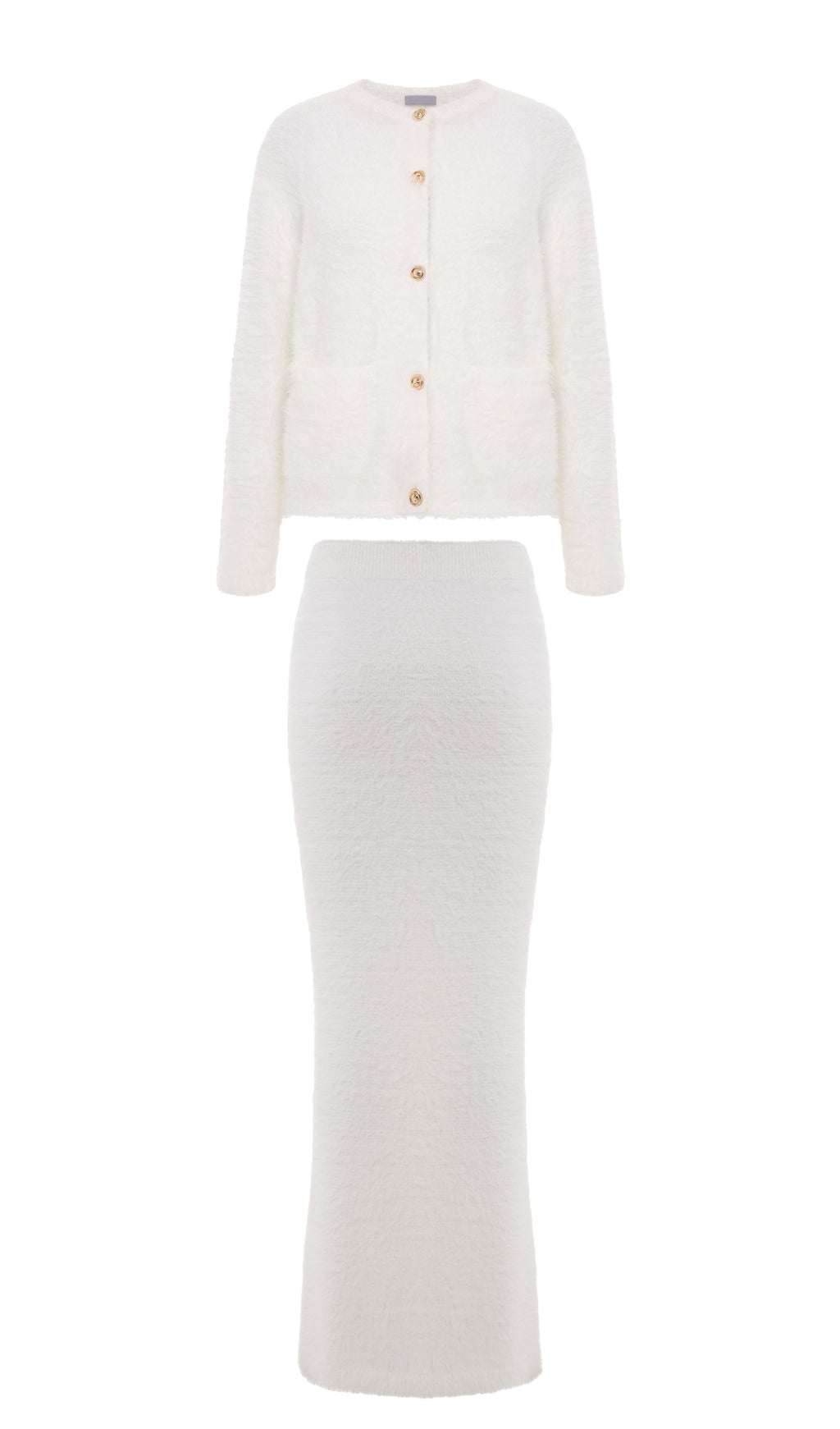 Soft, plush, and effortlessly refined, the Aria Set features a relaxed V-neck cardigan paired with a matching maxi skirt. Its cloud-like knit and clean silhouette create a cozy-luxurious look perfect for both elevated lounging and everyday elegance.