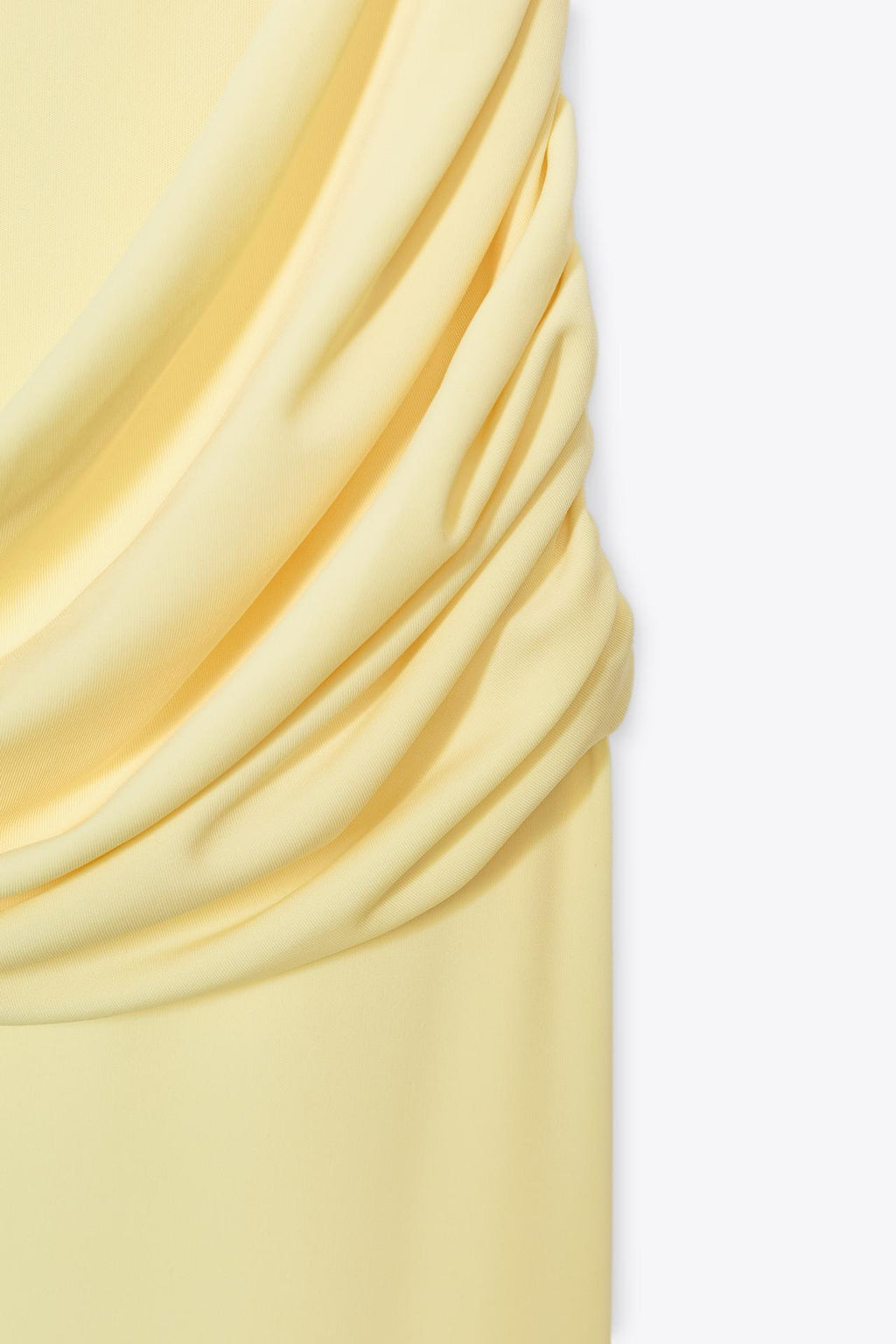 Crafted from soft stretch fabric, it features a high neckline, short sleeves with a subtle cape overlay, and an open back that reveals just enough. Gentle ruching at the waist defines the silhouette, while the floor-length hem adds graceful movement.