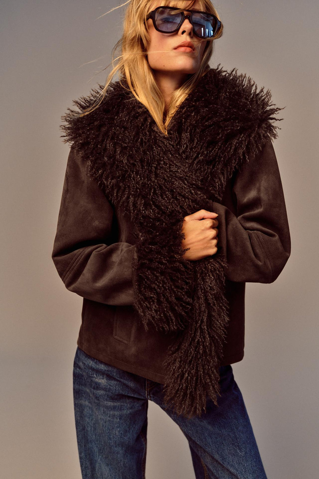 Crafted for effortless warmth and statement texture, the Aspen Shearling Jacket features a rich faux-suede exterior lined with plush shag shearling that peeks through the collar, cuffs, and hem. Its relaxed silhouette and sculpted seams balance structure with ease, creating a piece that feels both cozy and elevated.