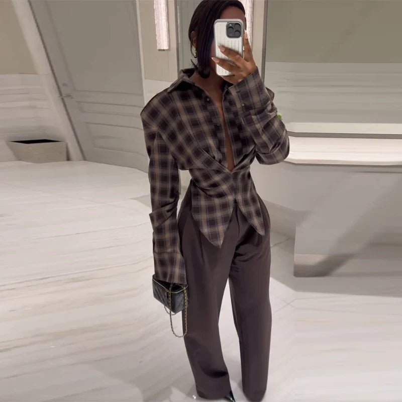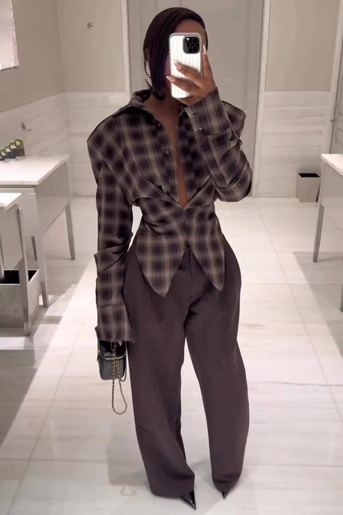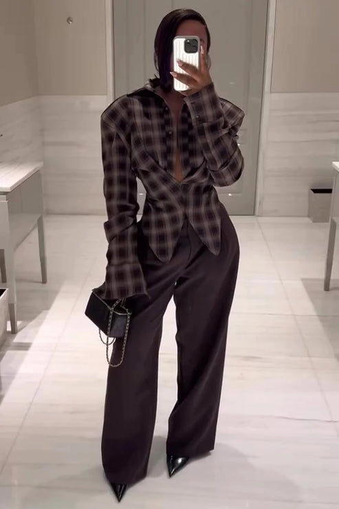 The Aubrey Cinched Check Shirt blends classic plaid with a sculpted, modern silhouette. Featuring a deep V-front, tapered waist, and softly structured shoulders, it creates an effortlessly defined shape with subtle drama. Finished with elongated cuffs and a muted chocolate check, it pairs seamlessly with tailored pants or denim for a polished, confident look.