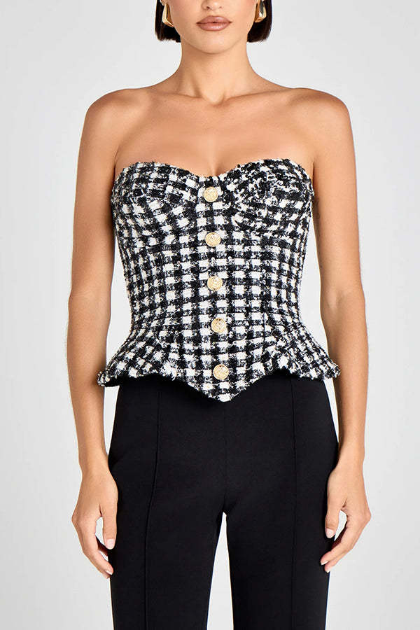 Structured yet romantic, the Clara Check Boucle Top is crafted from tactile tweed in a classic black-and-ivory check. The strapless sweetheart neckline and sculpted waist create a flattering silhouette, while gold-tone buttons lend a refined finish. Perfect for pairing with tailored trousers or sleek skirts, it brings timeless elegance with a modern edge.