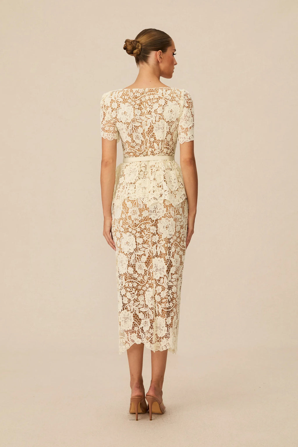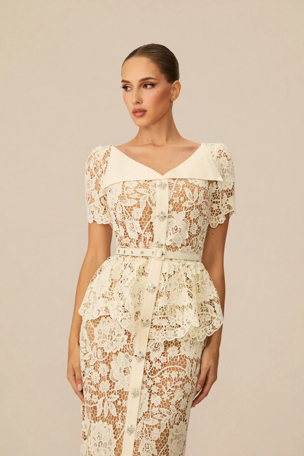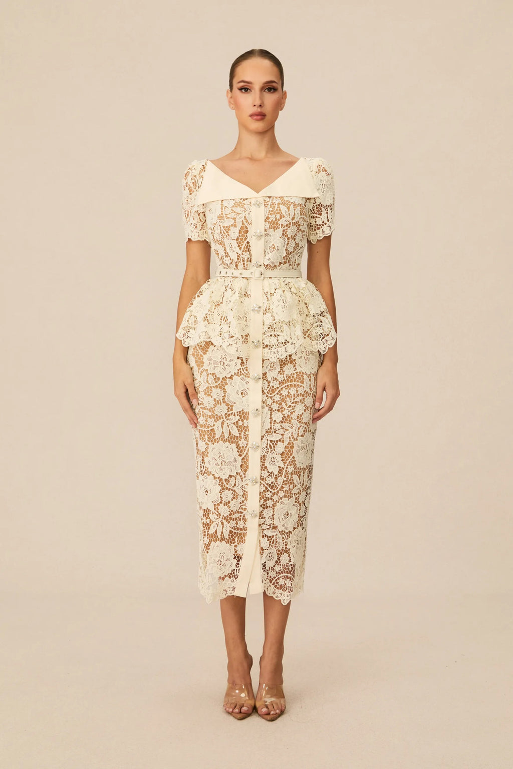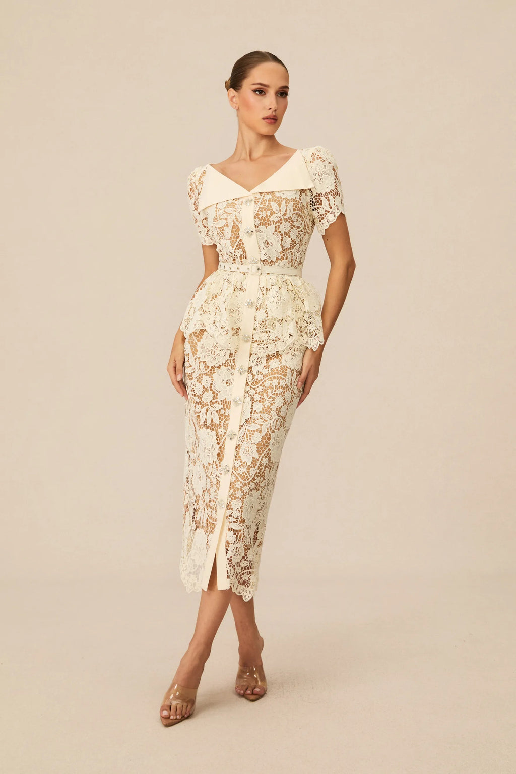 Crafted from intricate ivory lace, the Clara Lace Dress balances timeless romance with modern structure. Featuring a sculpted V-neckline, soft peplum waist, and a figure-skimming midi silhouette, it flatters from every angle. The tonal lining and covered button detailing add a touch of vintage charm, making it perfect for elegant gatherings, garden weddings, or elevated daytime events.