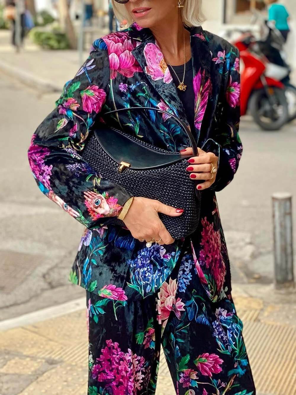 Cut from plush velvet with a lustrous finish, the Claudia Blazer brings a retro flourish to modern tailoring. Its inky black base is enlivened with vivid blooms in saturated pinks, violets, and emerald tones—each petal rendered with painterly depth and dimension. Designed with a softly structured shoulder, notched lapel, and relaxed, elongated fit, it drapes with quiet confidence.