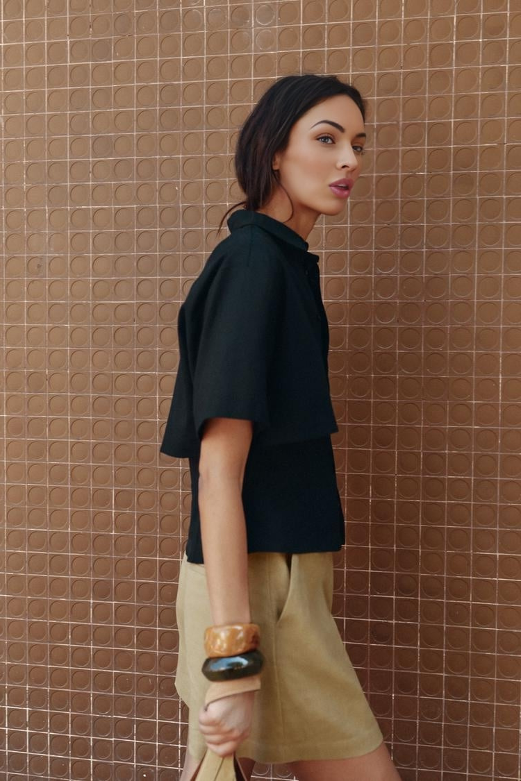 A study in contrast, soft linen, sharp lines. The Dualité Top captures balance in motion: effortless yet composed, feminine yet strong. Its double-layer front and lapel collar lend quiet sophistication, designed for days when simplicity speaks loudest.