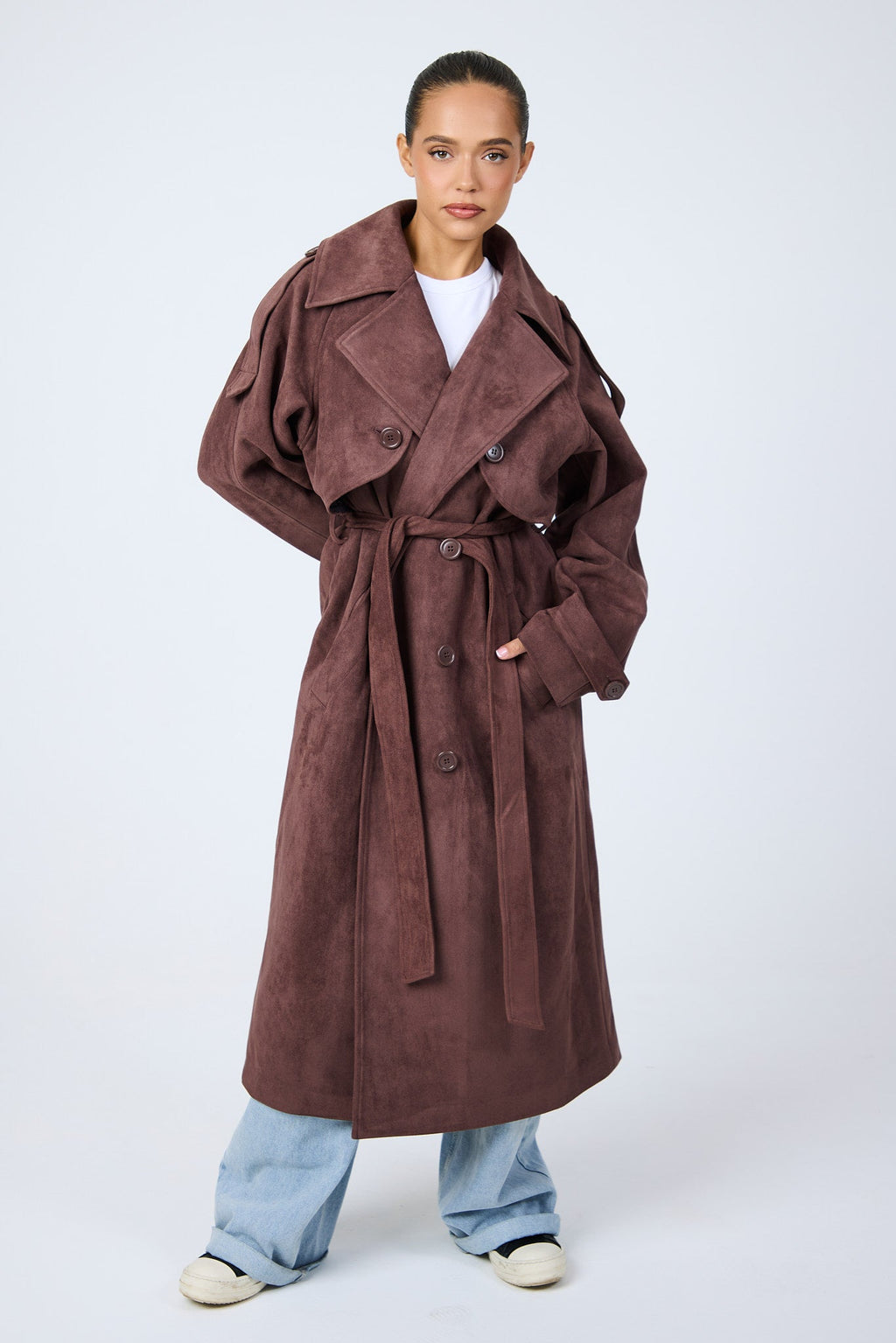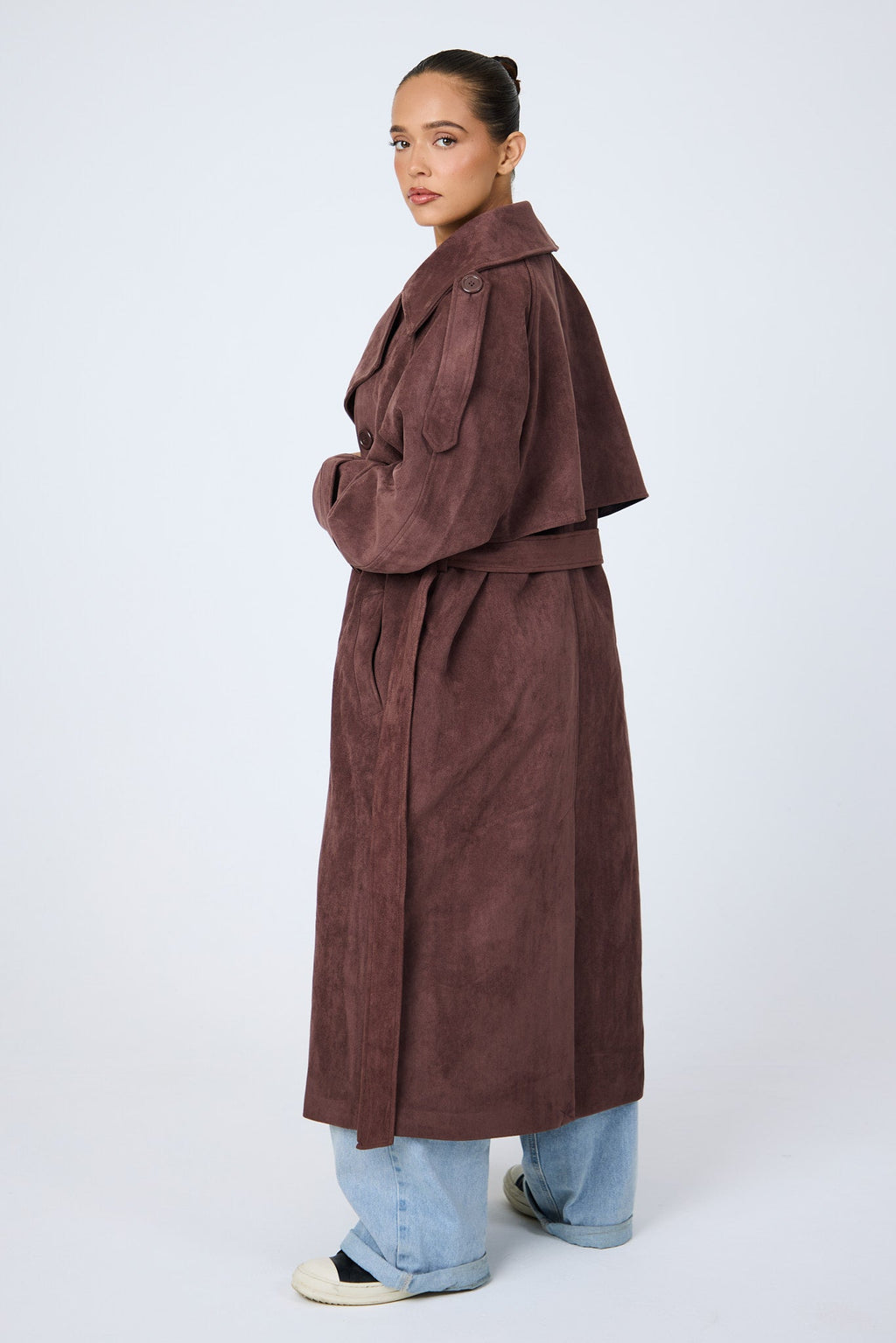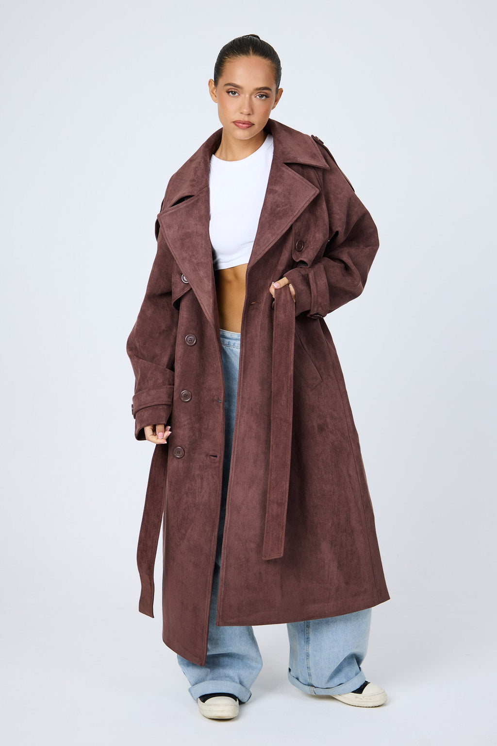 Soft faux suede meets a relaxed, longline silhouette in the Eeden Suede Trench Coat. Featuring oversized lapels and subtle classic detailing, it drapes with effortless ease. Fully lined and timelessly refined, it adds instant sophistication to any look.