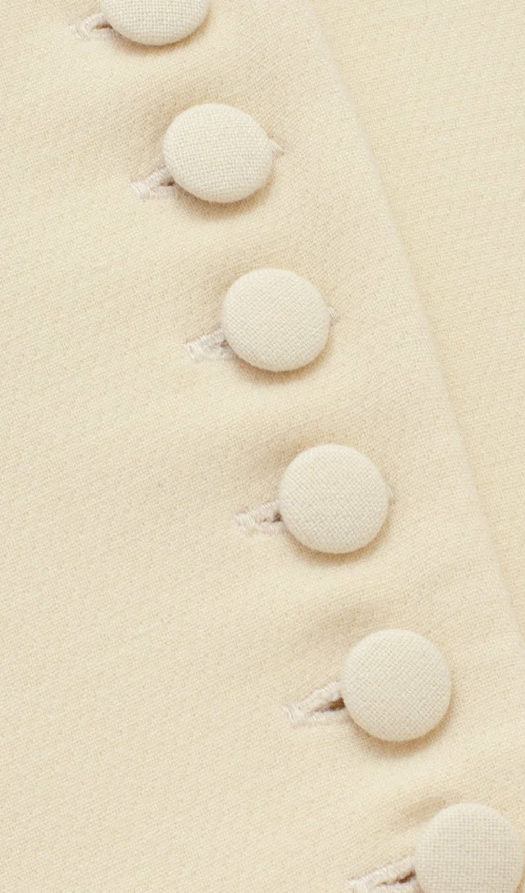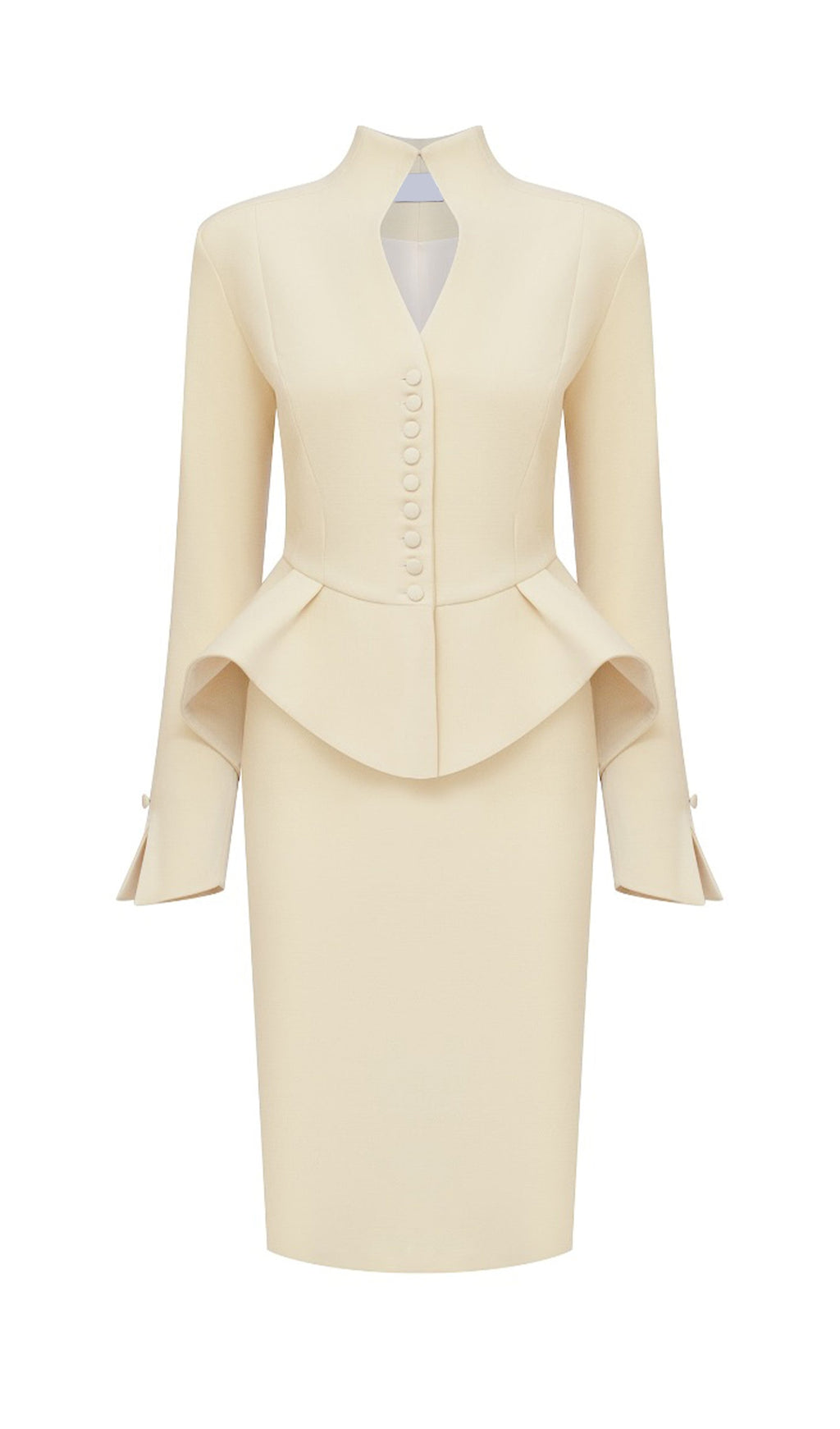Tailored in a smooth cream fabric, this set pairs a sculpted peplum jacket with a clean, streamlined midi skirt. The keyhole neckline and covered buttons add refined detail, while the flared waist brings a softly feminine shape. Elegant, polished, and timeless, perfect for occasions that call for quiet sophistication.