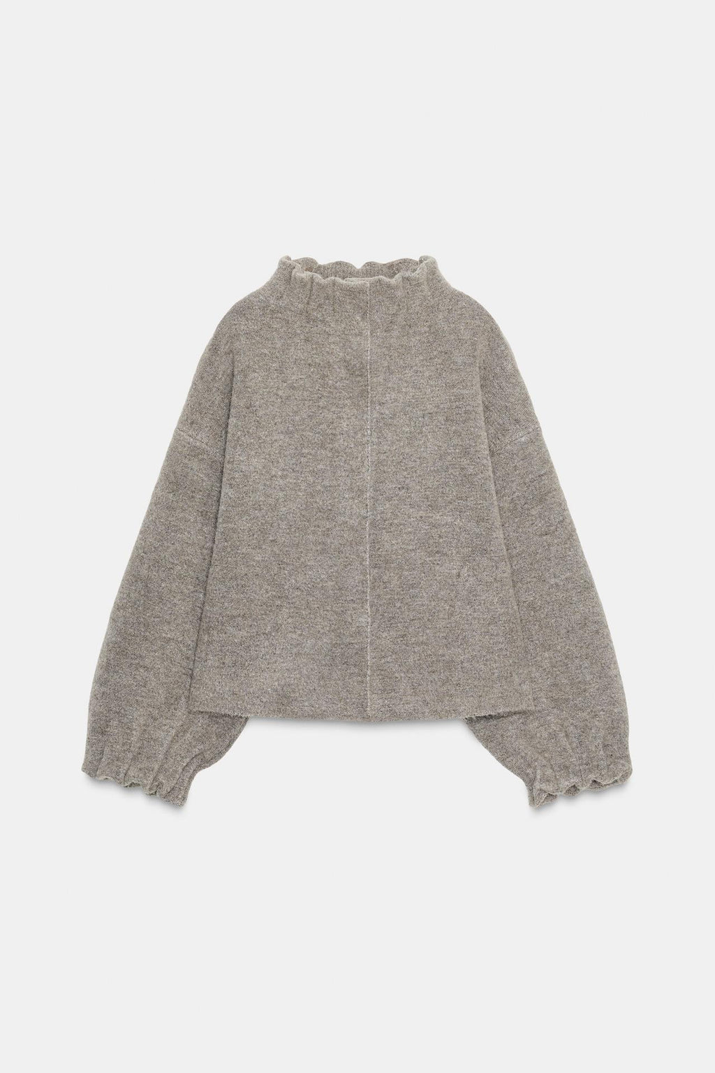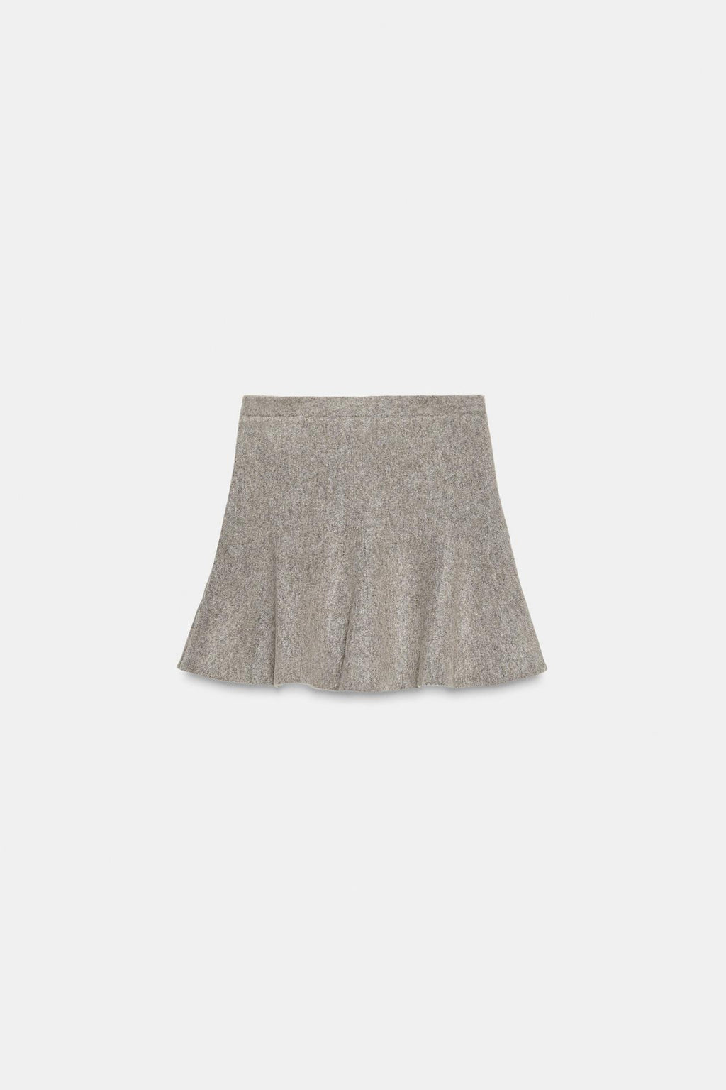 Crafted from a soft knit, the set features a sculpted bomber-style jacket with a high collar and subtle volume through the sleeves, paired with a matching mid-length skirt that follows the body with effortless ease.