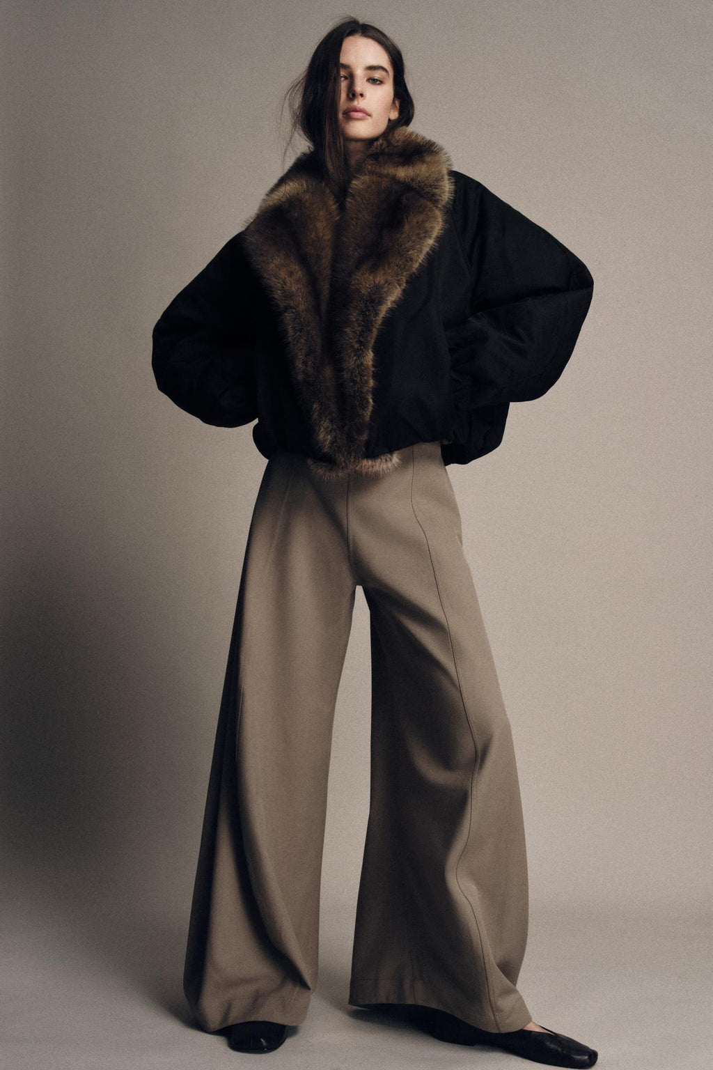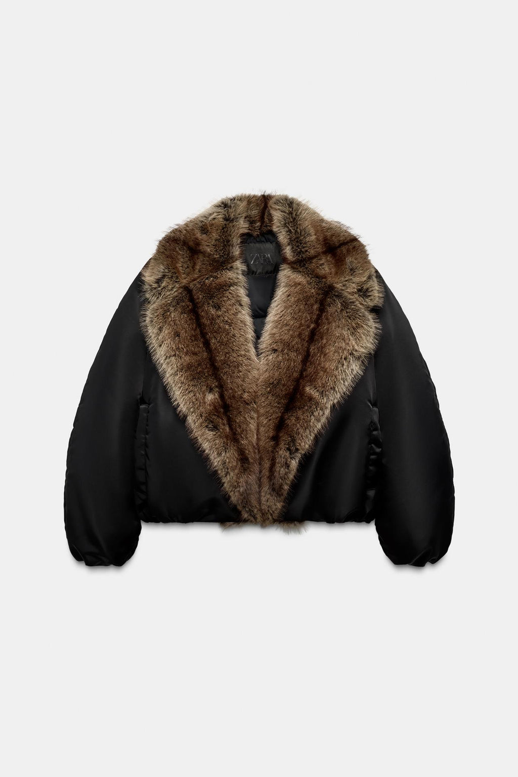 Bomber jacket with a lapel collar and faux fur trim. Long sleeves. Puffed hem. Front fastening.