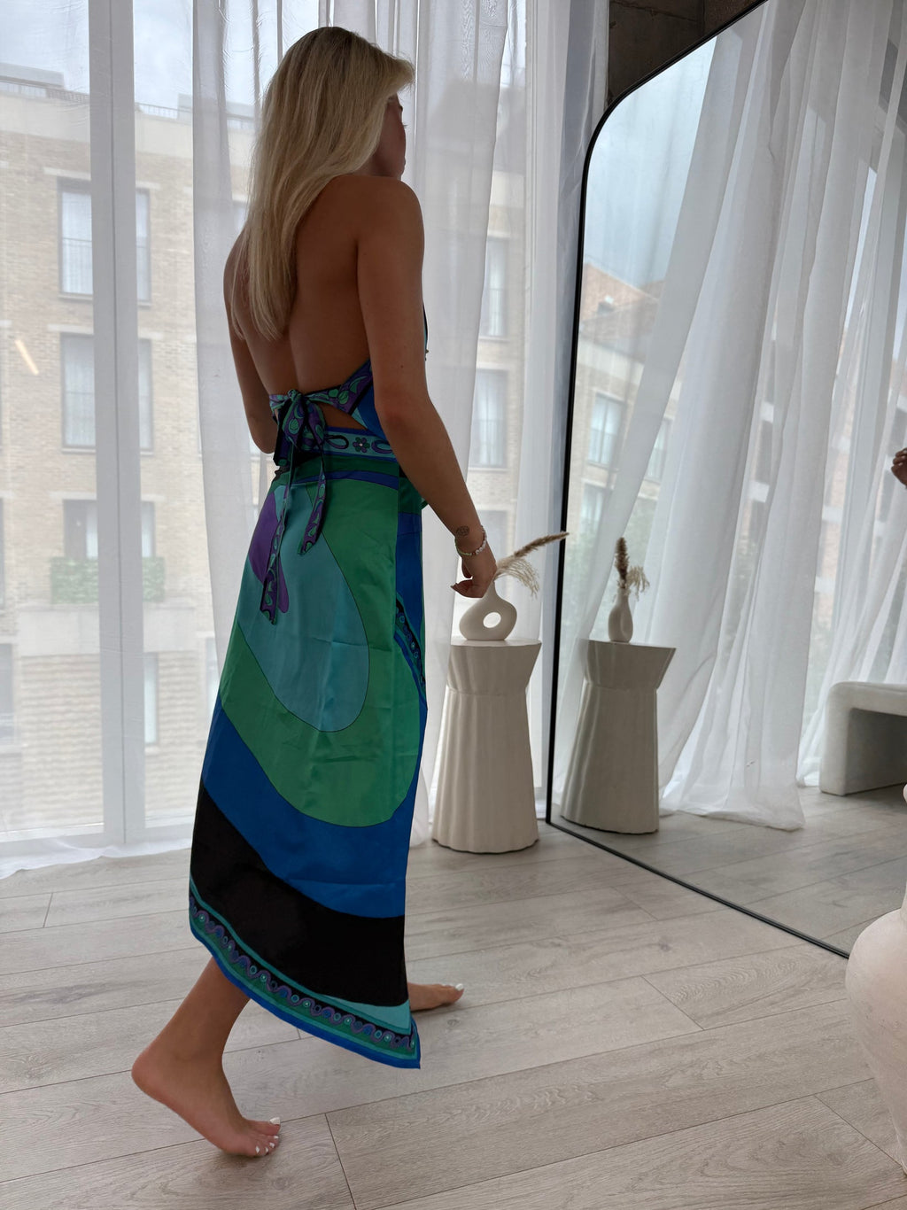Cut in a soft, lightweight fabric with a bold artistic print, this dress features a halter neckline and fluid drape that skims the body effortlessly. The asymmetrical hem adds movement, making it perfect for warm days, dinners abroad, and everything in between.