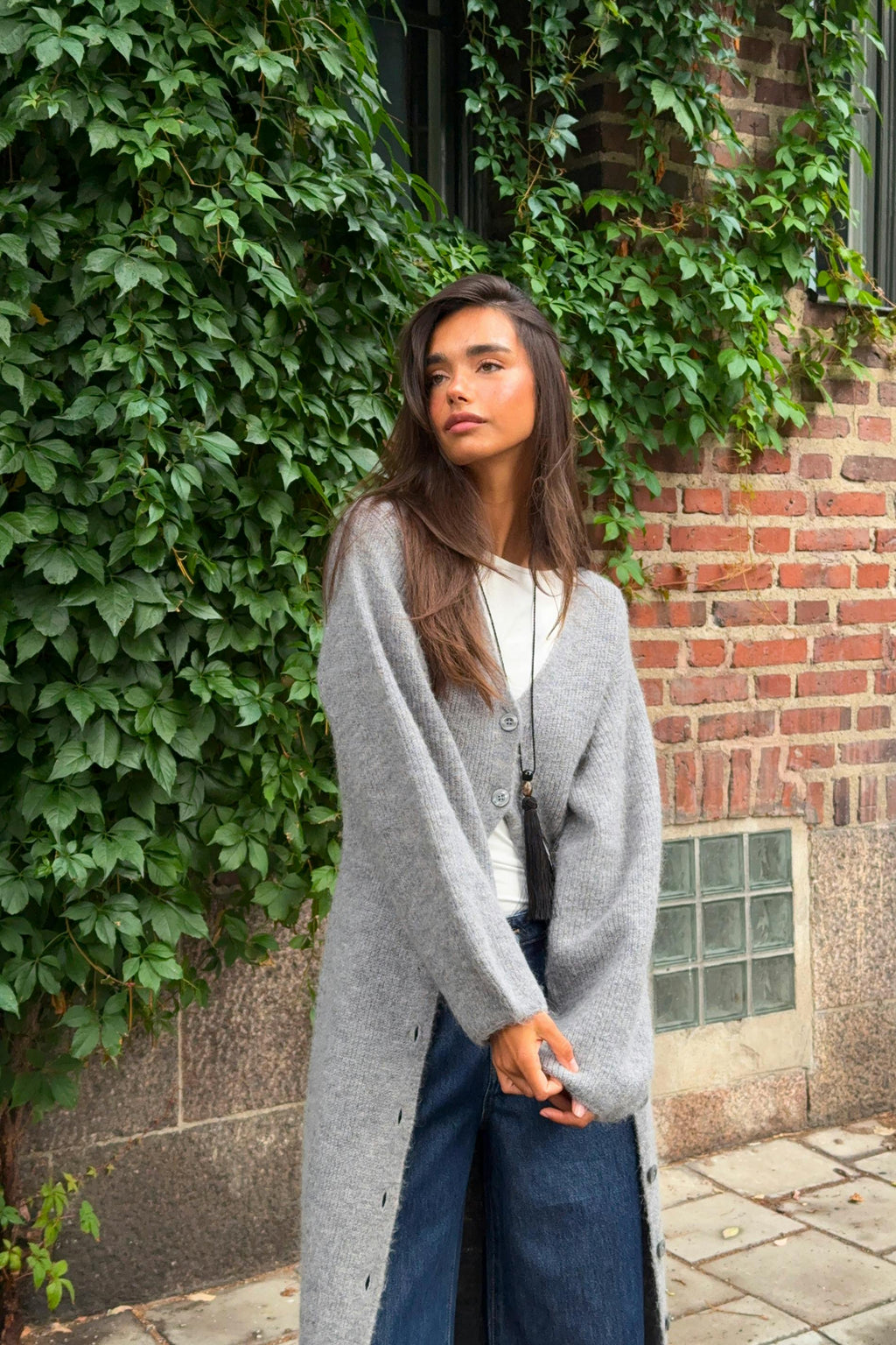 Long knitted dress with buttons down the front. Dress has a V-neck. It has a fitted silhouette, long sleeves, and a slit at the front.