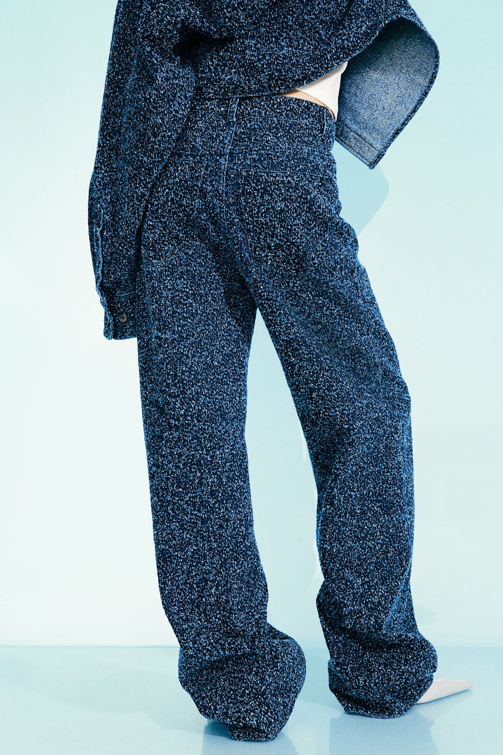 Crafted from premium boucle-woven denim, it offers a soft yet sculpted drape that moves effortlessly with the body.