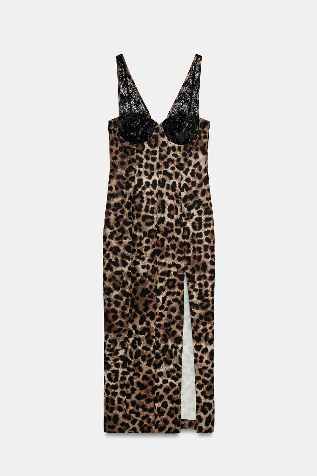 Crafted from fluid satin with a bold leopard print, the Lace Detail Leopard Dress brings a touch of effortless allure to any occasion. Designed with delicate lace trim along the neckline and a sultry side slit, it skims the body for a flattering, feminine fit.