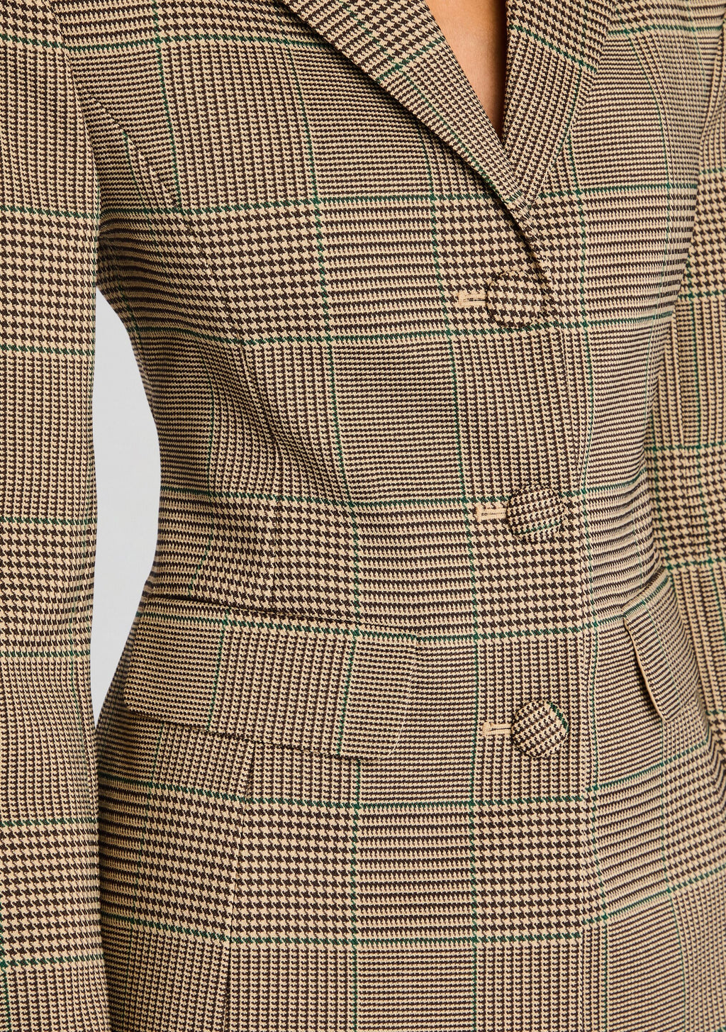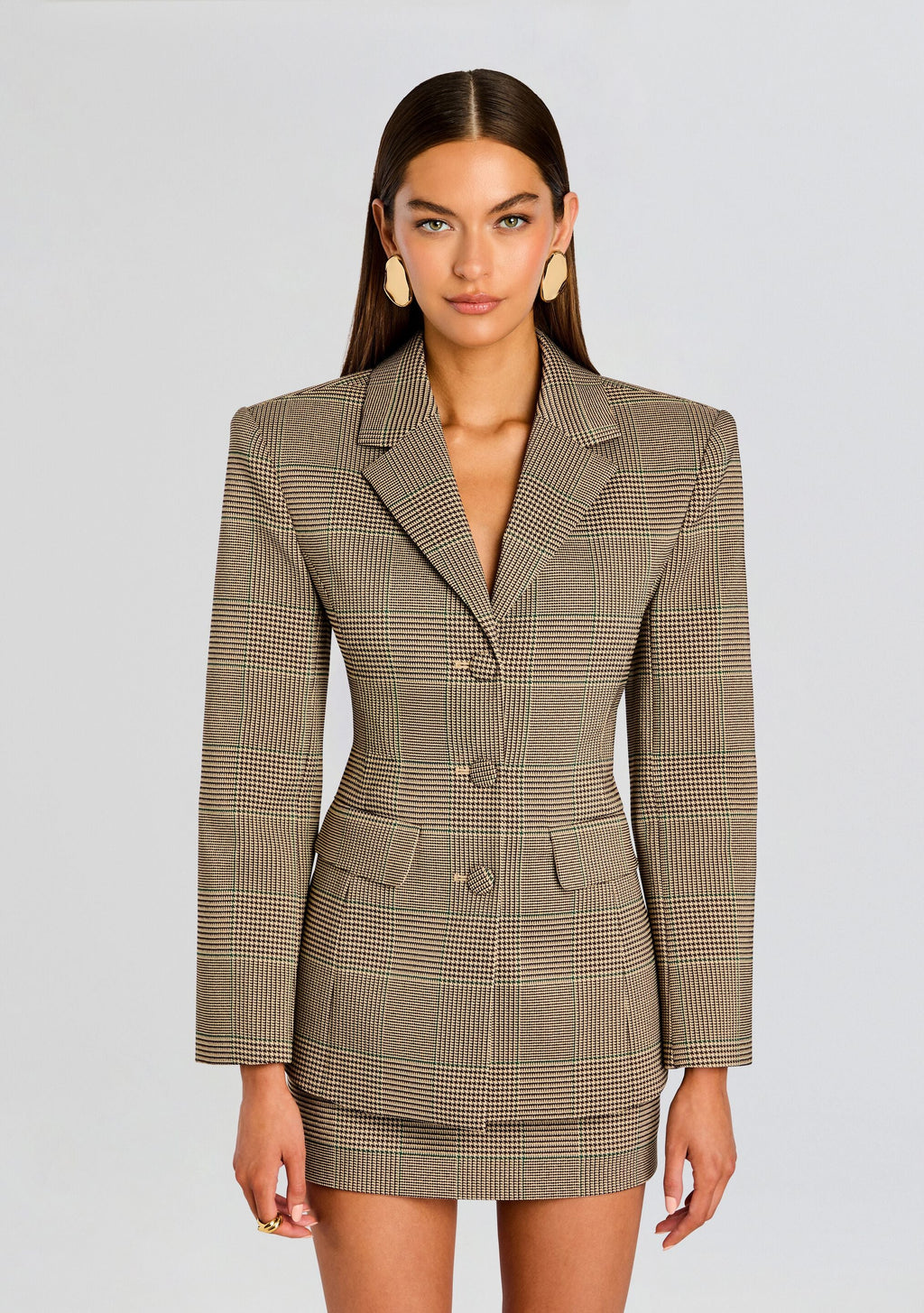 A sharply tailored plaid blazer with strong shoulders, a cinched waist, and classic notch lapels. Finished with refined button detailing and structured lines, it delivers polished, modern power—perfect for pairing with minis, denim, or trousers for an elevated, confident look.