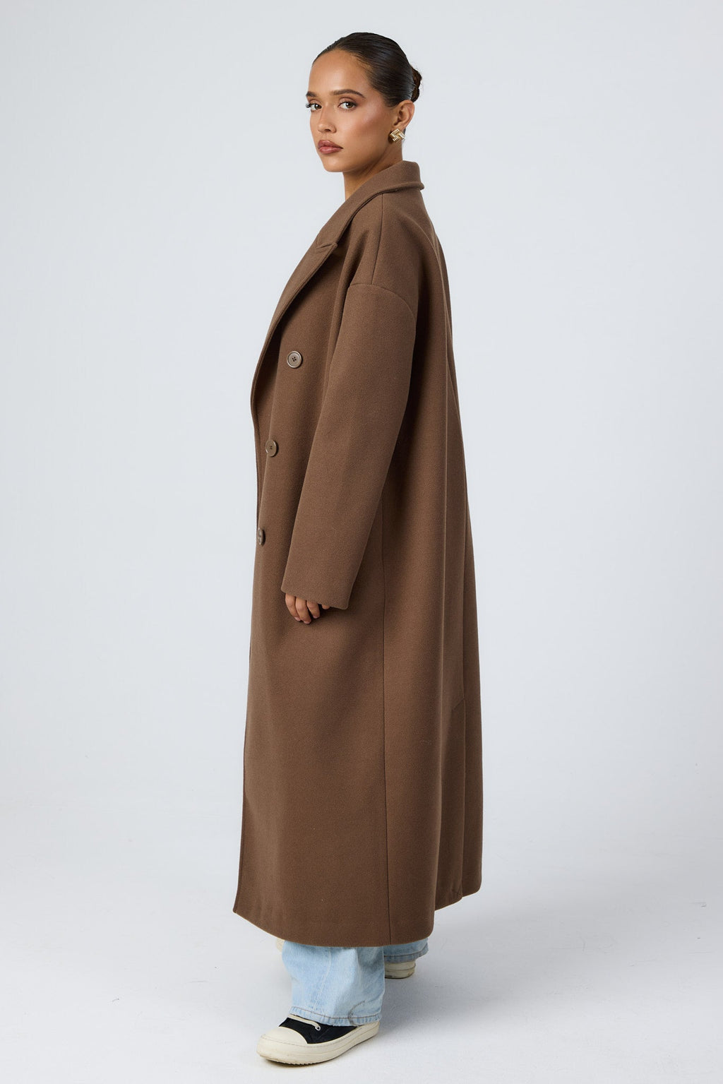 Cut from a soft camel wool-blend, the Mara Oversized Wool Trench delivers relaxed structure with its broad lapels, double-breasted front, and sweeping full-length silhouette. Warm, minimal, and effortlessly polished, it's the layer that elevates every outfit.