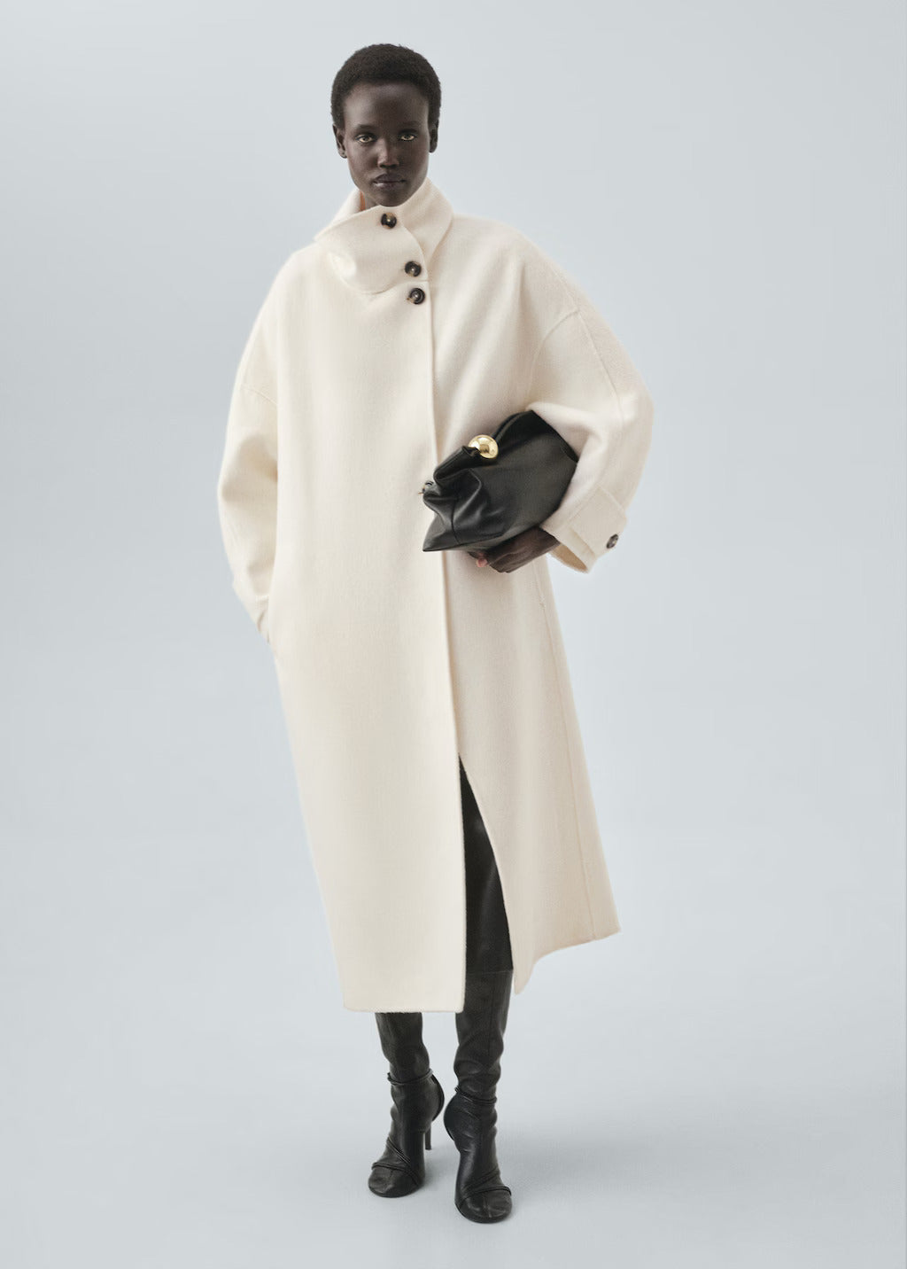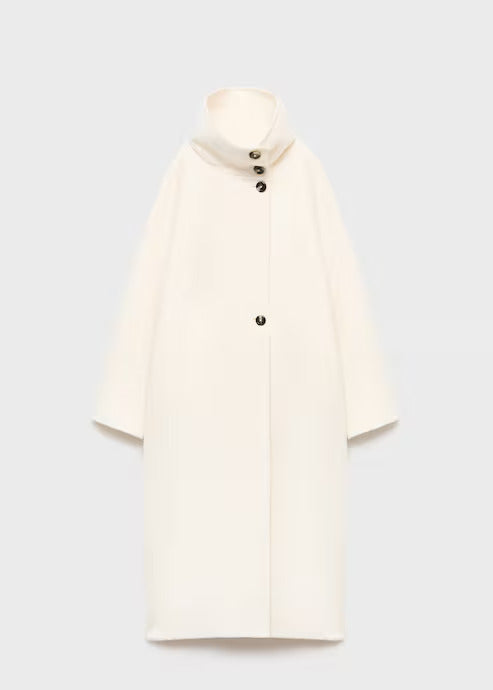 Tailored from a premium wool blend with a soft brushed finish, it features an oversized silhouette, high funnel neckline, and sculpted wrap front secured with statement buttons. The dropped shoulders and longline cut create a fluid yet architectural shape that drapes effortlessly over any look.