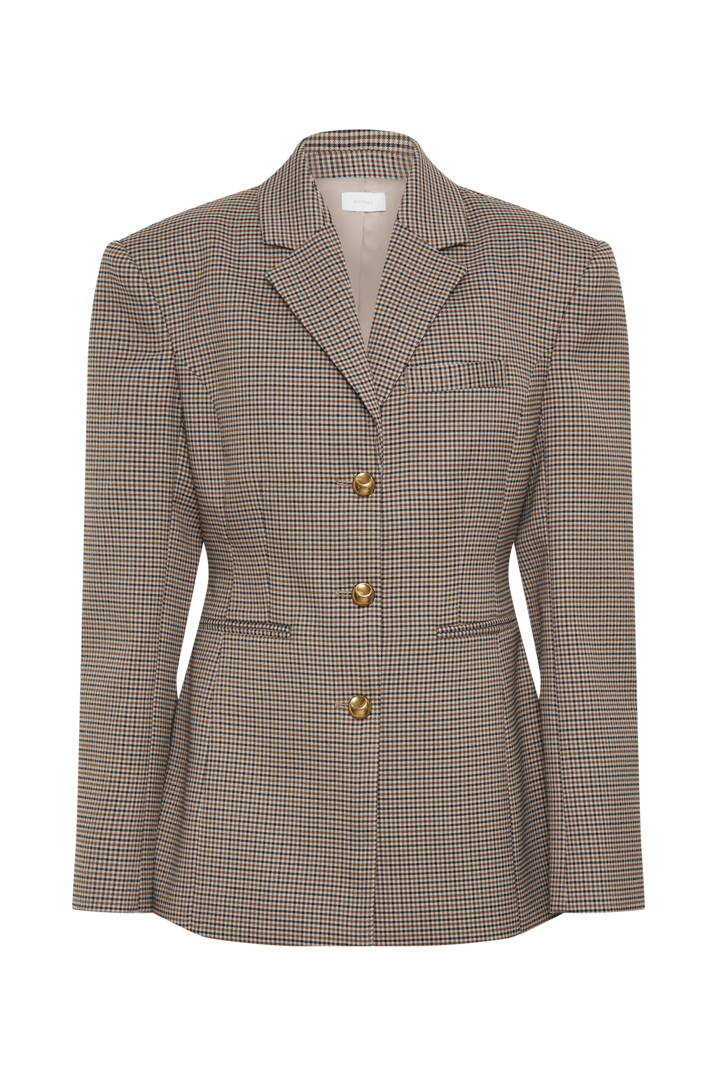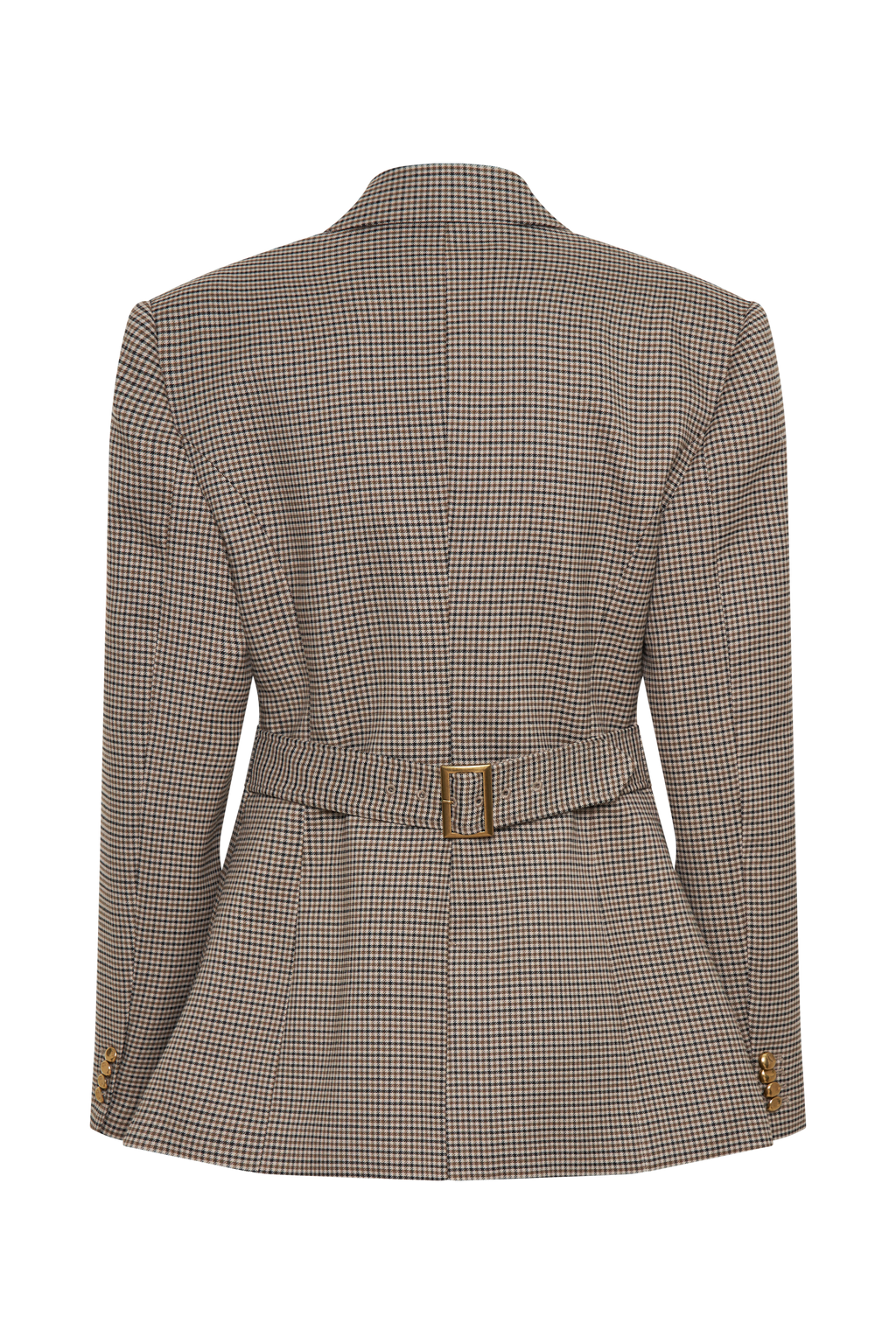 Impeccably structured and editor-level chic, this tan check blazer sculpts the figure with a tailored silhouette that feels both powerful and refined. Sharp lapels and strong shoulders create a clean architectural line, while the fitted waist—enhanced by a matching back belt—adds feminine definition. Gold statement buttons punctuate the front, elevating the classic check pattern with a touch of polished glamour.