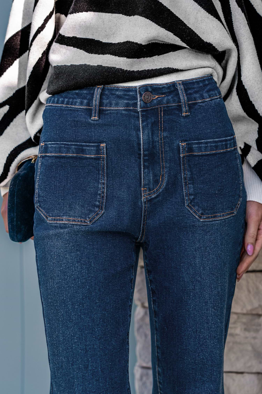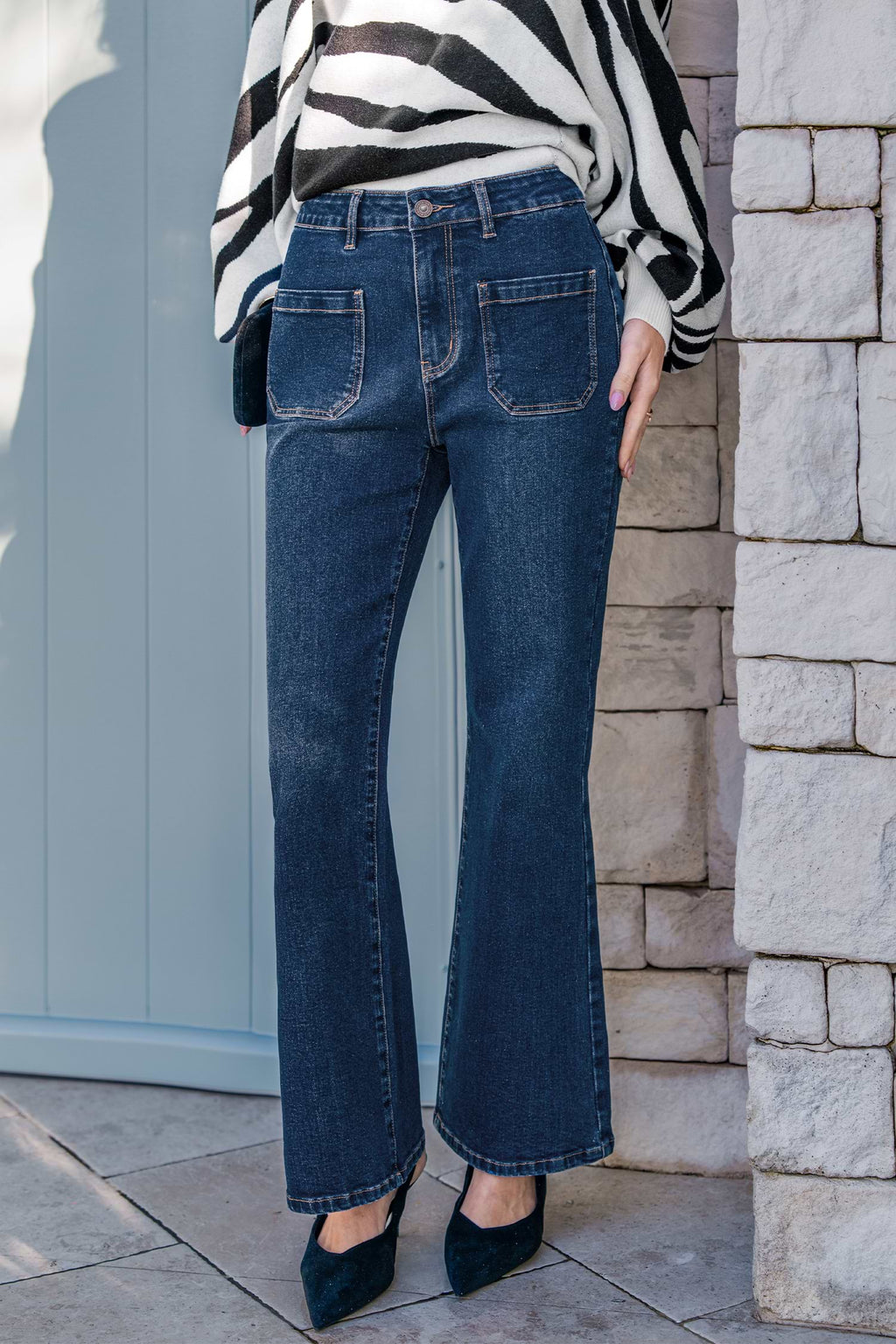 Crafted from soft indigo denim, these high-rise jeans feature bold front patch pockets and a subtly flared leg for an effortlessly elongated silhouette. Clean, modern, and universally flattering, they bring easy polish to everyday styling.