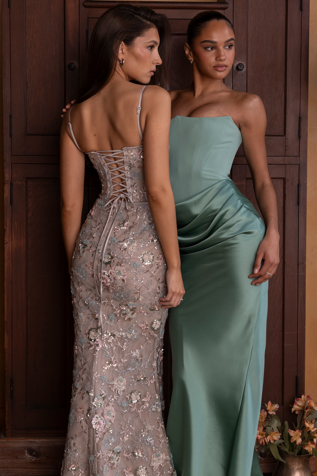 The Naima Gown is a masterpiece of opulence and structure. Hand-embellished with intricate bronze beadwork, it shimmers softly with every movement, catching the light in all the right places. The corseted bodice sculpts the waist and accentuates the décolletage, while the slender straps and floor-grazing hem create a statuesque silhouette.