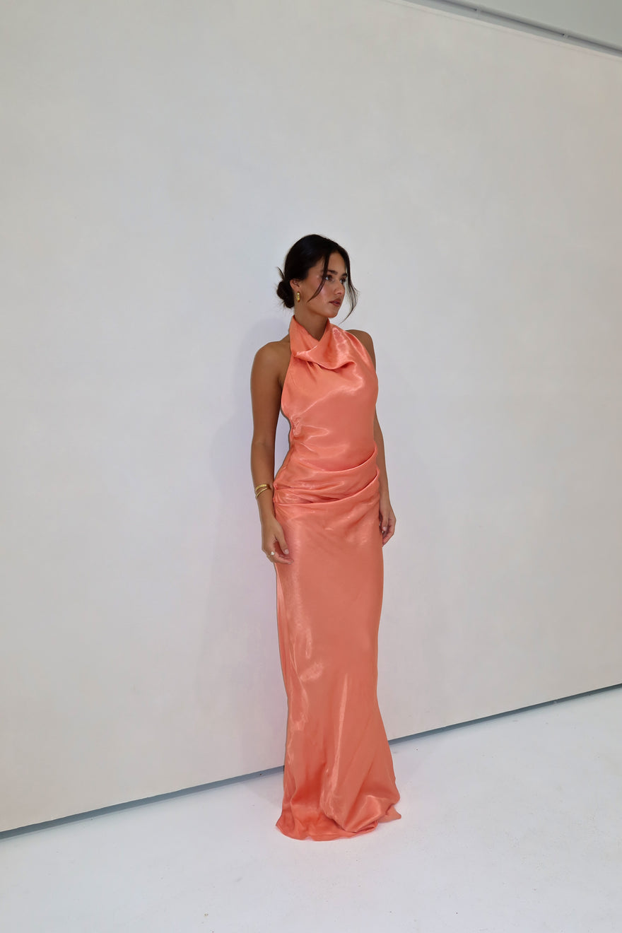 A fluid satin halter dress with soft gathering at the waist and a mid-length drape. Refined, effortless, and made for warm days into evening.
