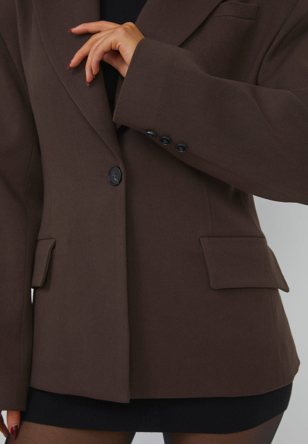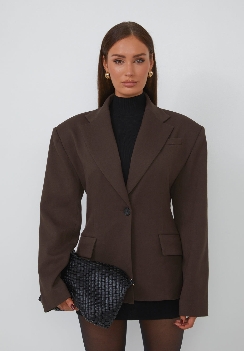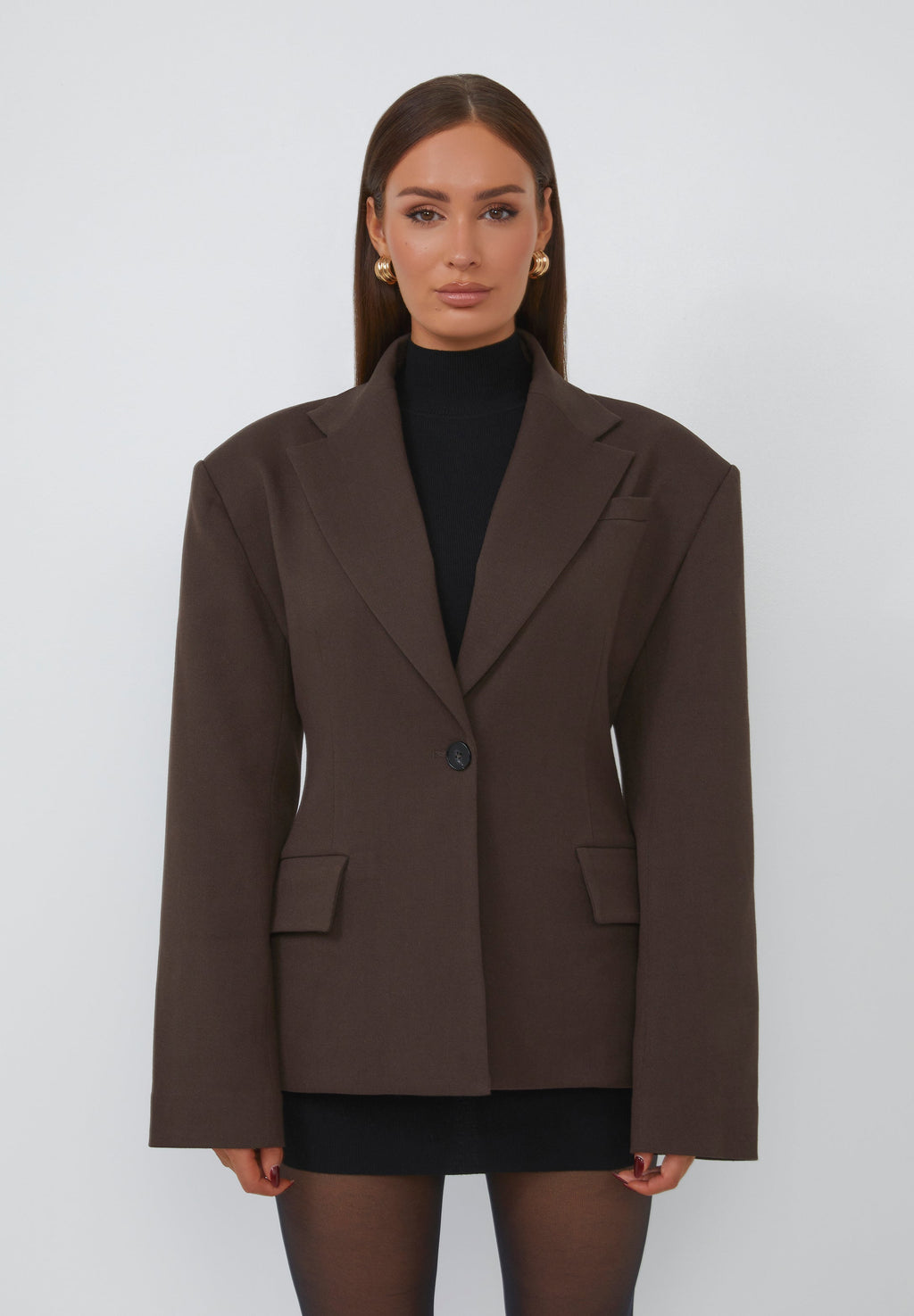 Clean, commanding, and beautifully minimal, this chocolate-brown blazer is cut with a sculpted precision that elevates modern tailoring. The sharp lapels and strong shoulders create an architectural line, while the single-button closure softly draws in the waist for a refined, balanced silhouette.
