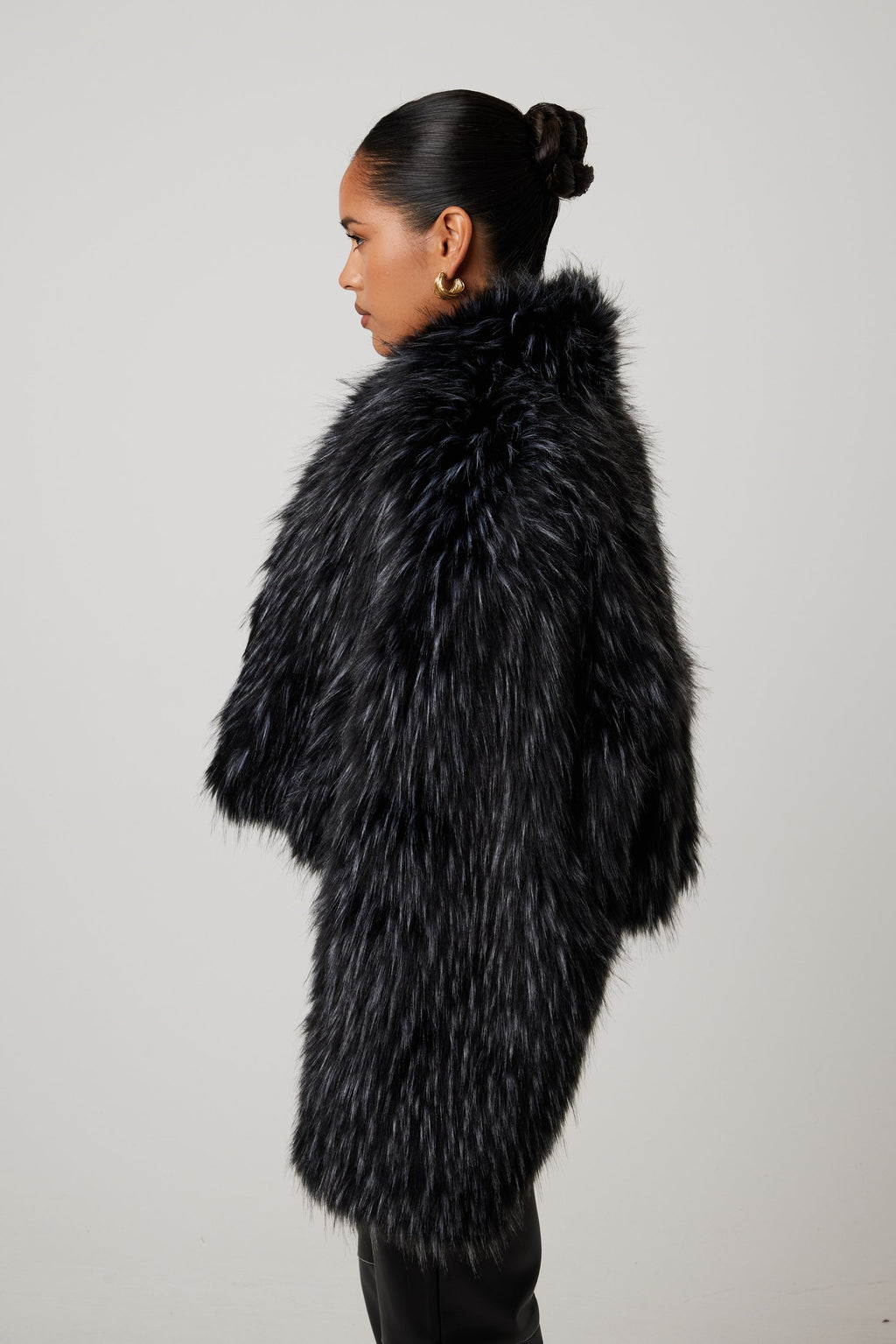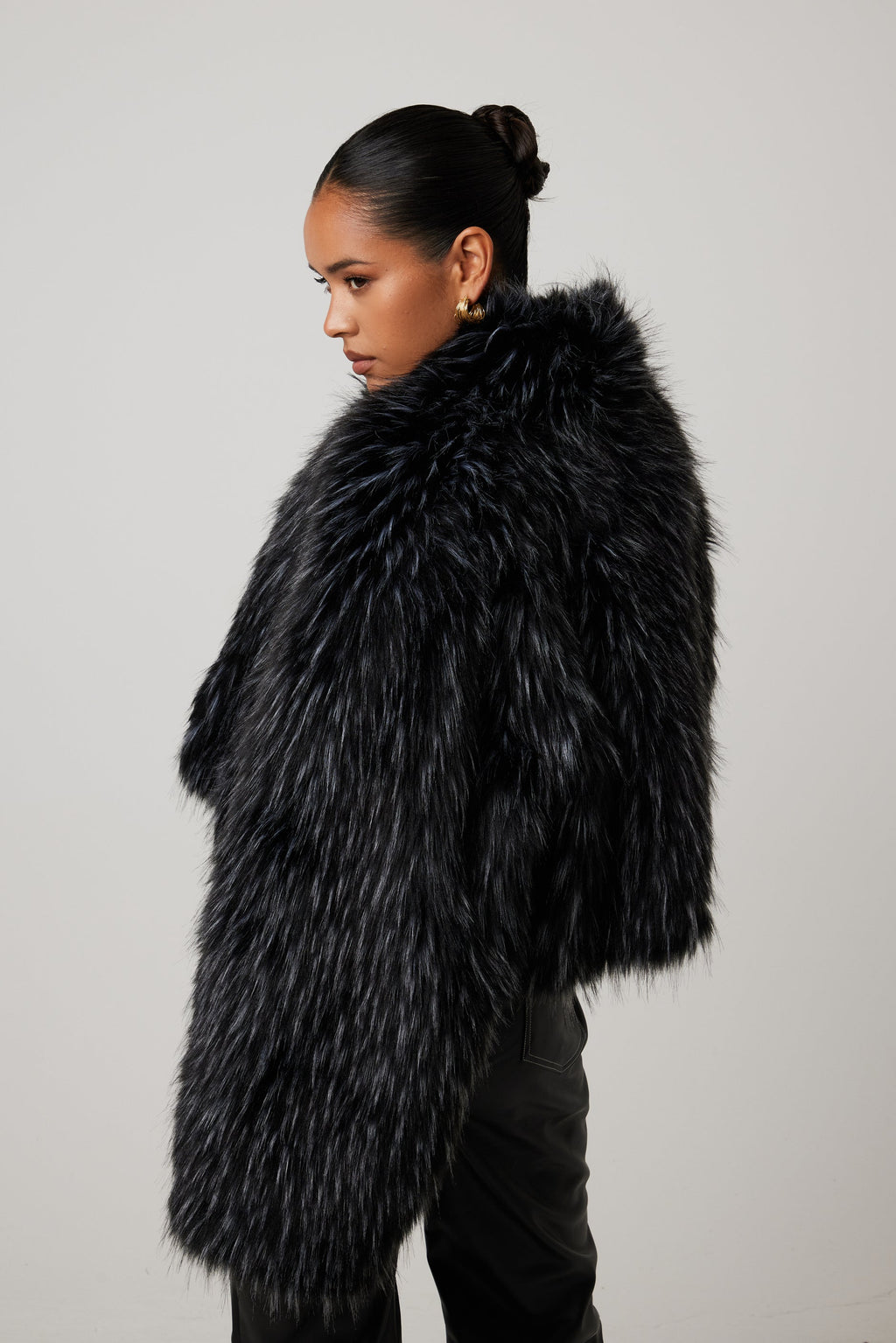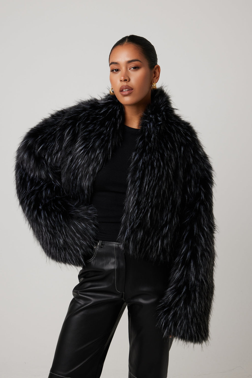 Wrapped in ultra-soft, high-pile faux fur, the Renee Jacket adds instant luxe texture to any look. Its cropped silhouette and voluminous sleeves create a bold, modern shape, while the sleek onyx finish brings effortless sophistication. Fully lined and incredibly plush, it’s the statement layer that transforms even the simplest outfit.