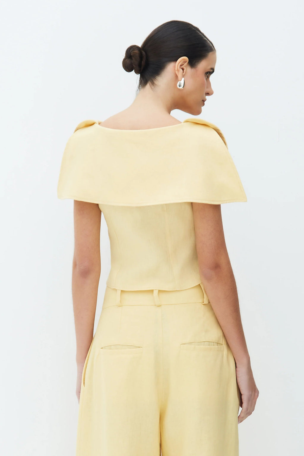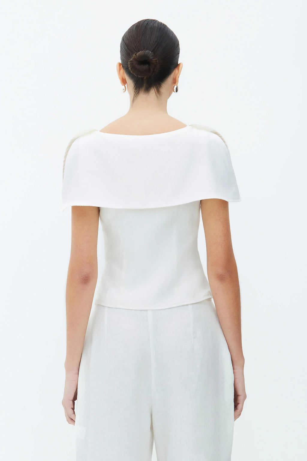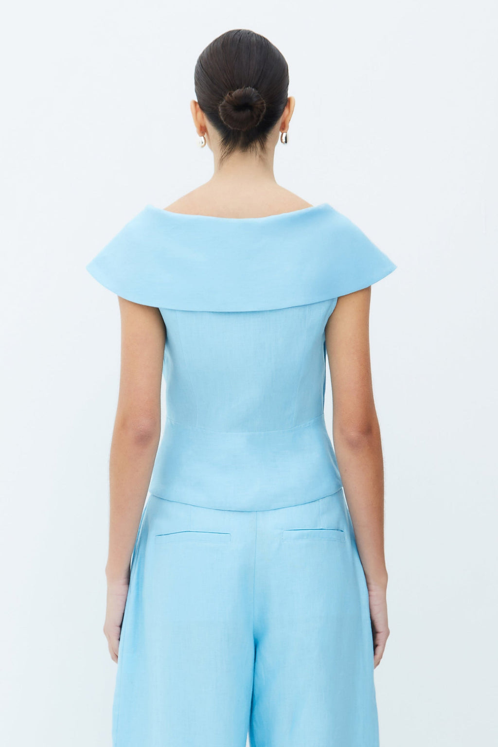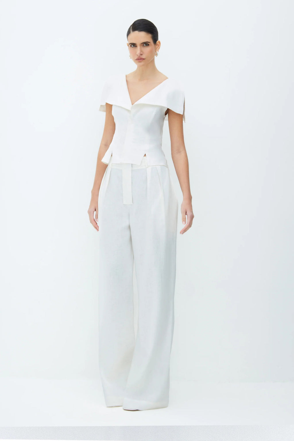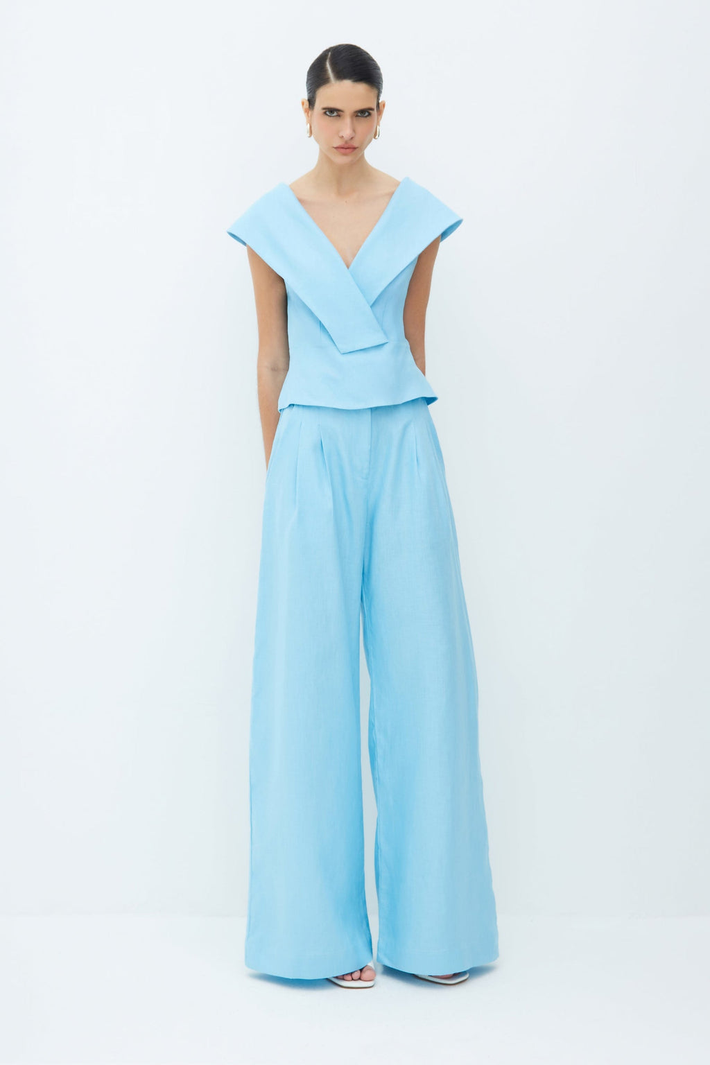 Cut from a smooth, lightweight fabric, the Rivera Set is defined by its clean lines and structured simplicity. The top features an off-shoulder foldover neckline that frames the collarbone, while the wide-leg trousers fall with a soft, fluid drape. Designed as a coordinated set for effortless polish, yet easy to style as separates.