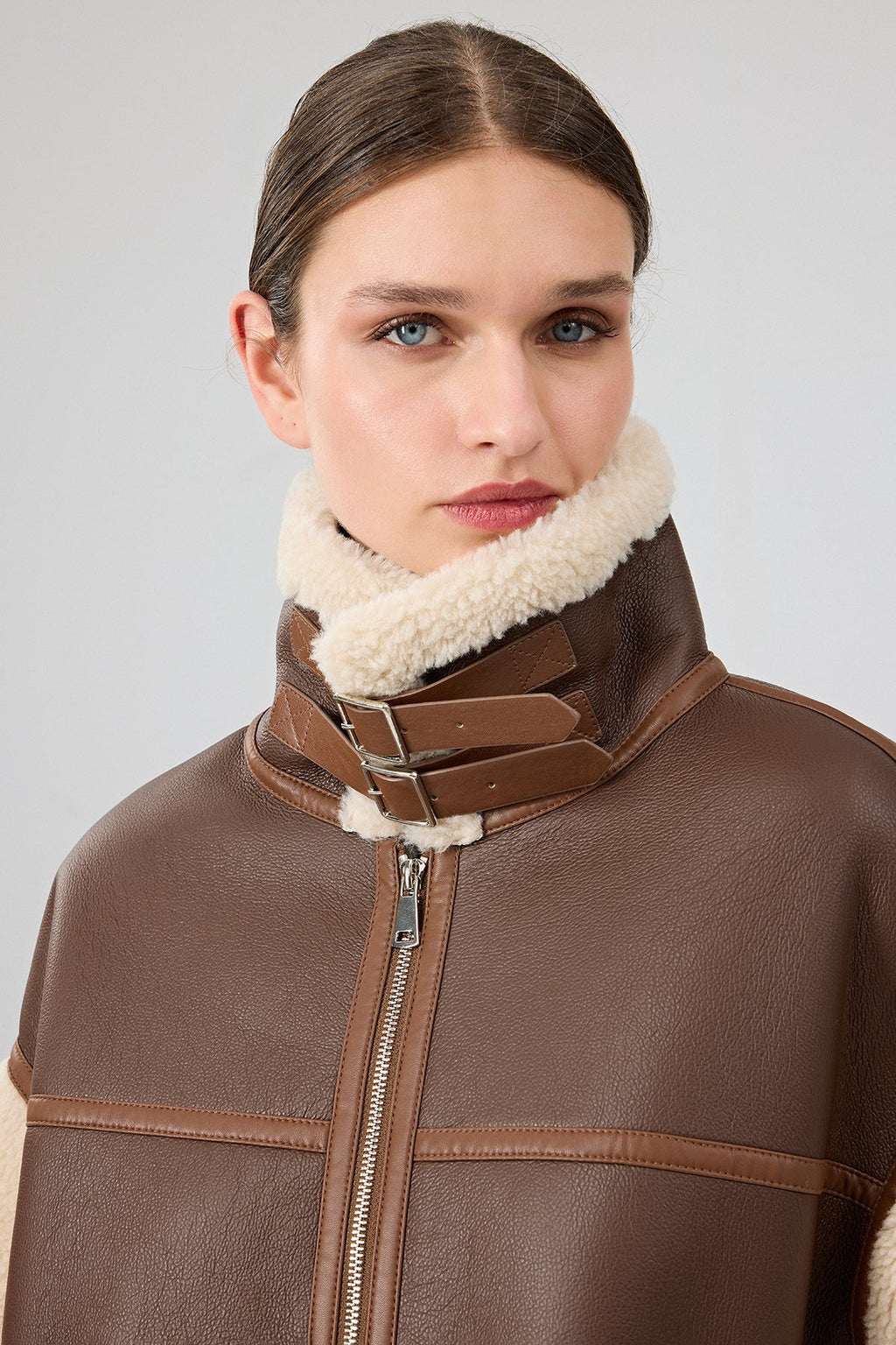 A cozy-meets-classic aviator jacket crafted with rich brown faux leather and plush sherpa lining. Oversized in silhouette with buckle collar details and structured seam work, it delivers warmth with effortlessly cool street-style energy—perfect for elevating everyday winter looks.