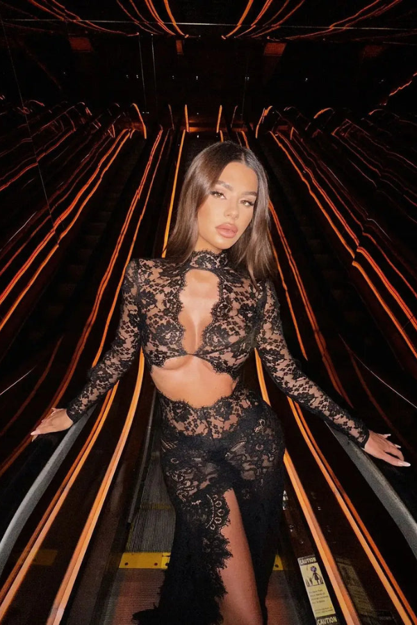 The Seraphina Lace Cutout Maxi Dress is a daring fusion of elegance and allure. Crafted from intricate black lace, it features a body-skimming silhouette with sheer detailing that reveals just the right amount of skin. The delicate scalloped edges trace the neckline and waist cutouts, while the high slit adds fluidity and bold sophistication.