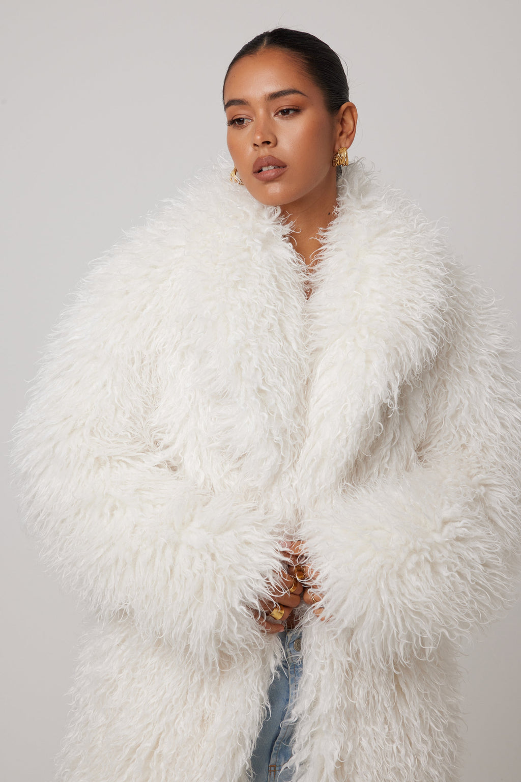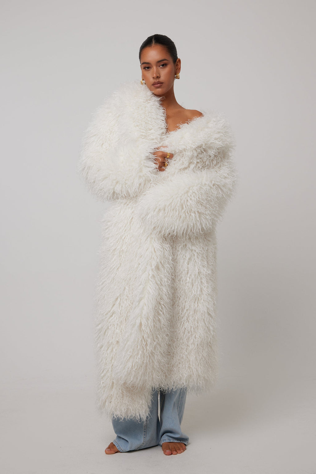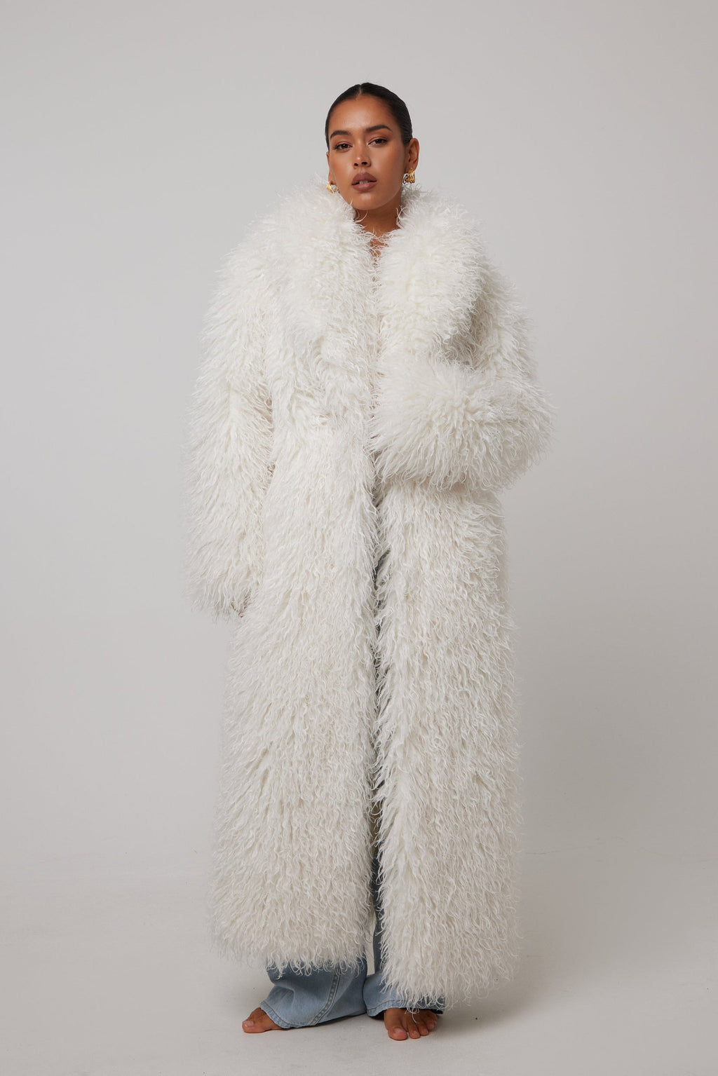 Crafted from ultra-plush faux fur, the Sienna Coat delivers instant winter glamour. The long, enveloping silhouette and oversized collar create a soft, dramatic presence, while the smooth lining ensures effortless comfort. Bold yet timeless, it elevates denim, eveningwear, and everything in between with luxurious ease.