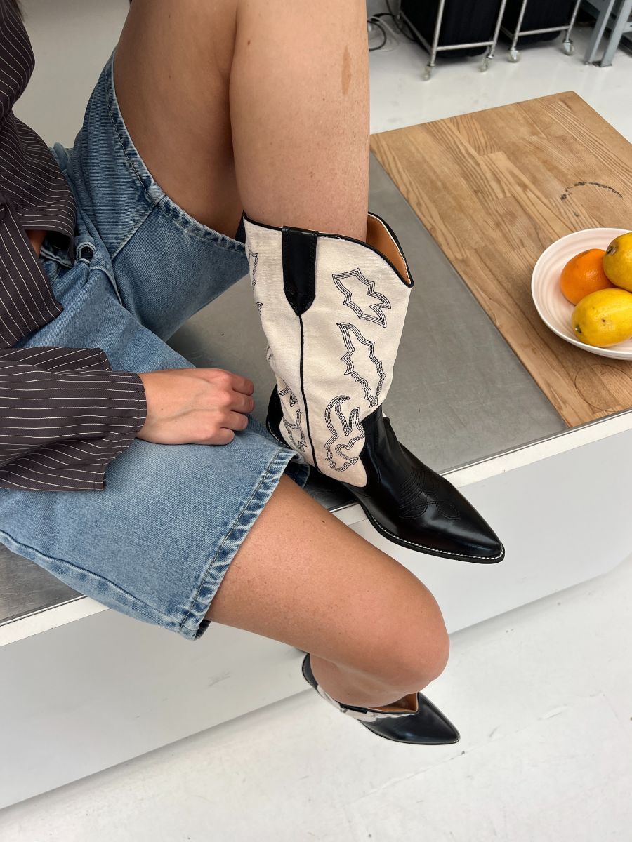 The Sienna Western Boots fuse classic cowboy charm with a modern silhouette. Crafted from smooth black faux leather and cream panels with flame-inspired stitching, they feature a pointed toe, angled block heel, and easy pull tabs. Bold yet versatile, they bring effortless attitude to any look, from vintage denim to flowy dresses.