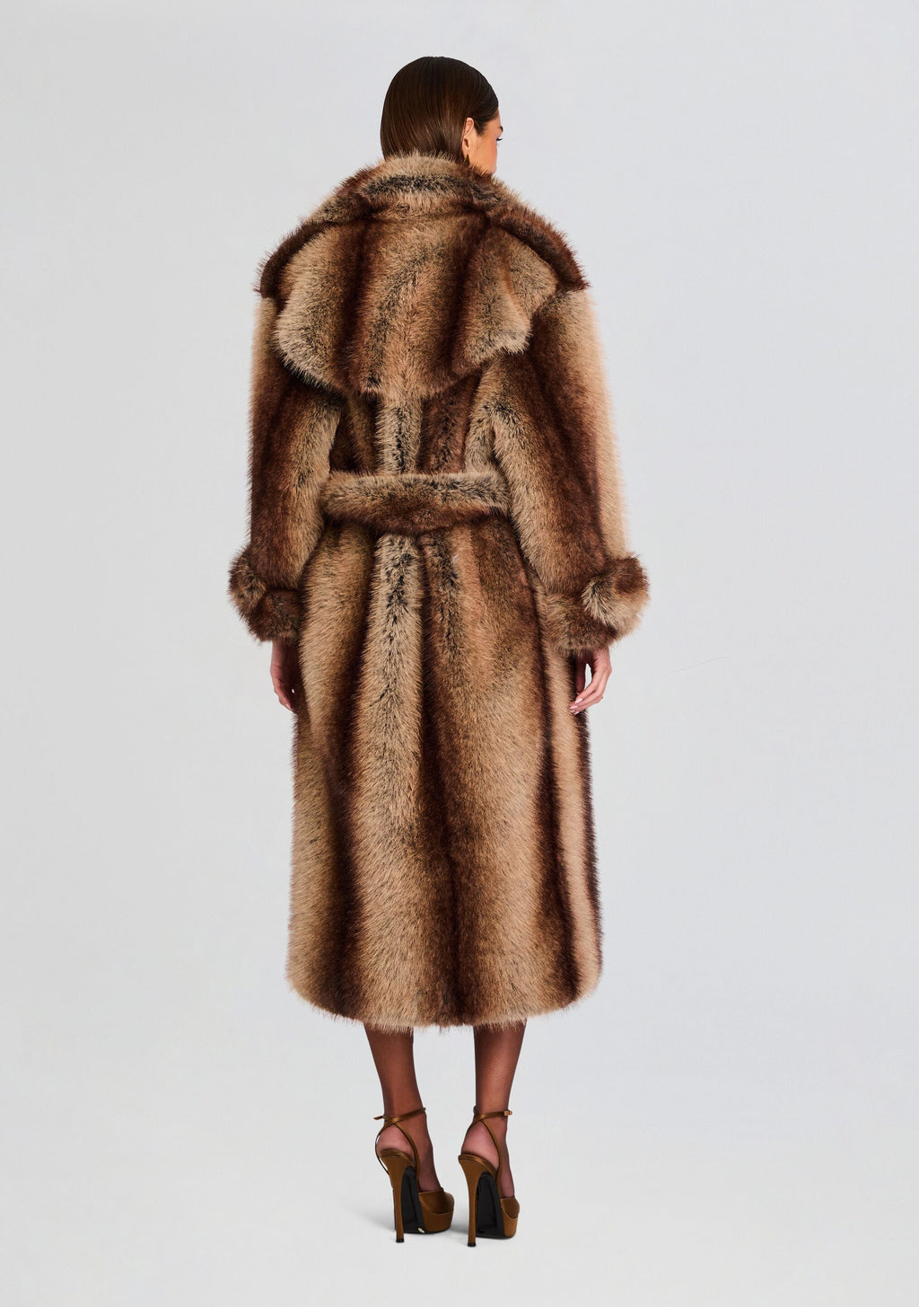 A dramatic longline faux fur coat crafted in rich, tonal browns for a luxe, high-impact finish. With its voluminous collar, full-length silhouette, and plush texture, it delivers instant glamour and warmth—perfect for elevating night-out looks or making a bold statement in the cold.
